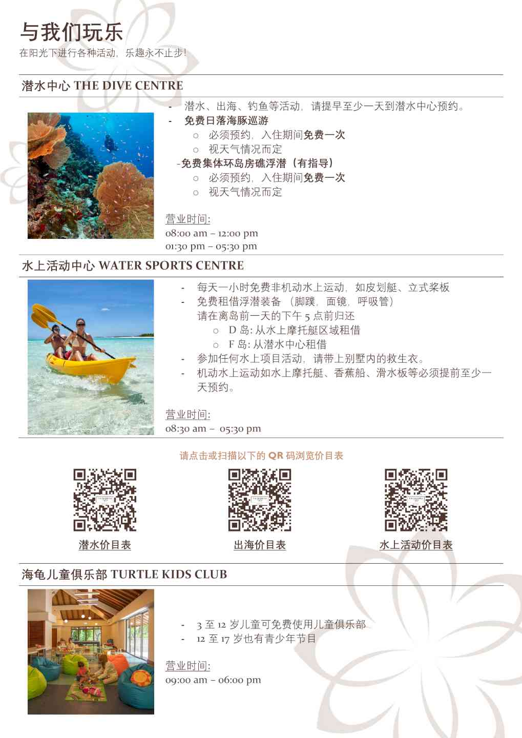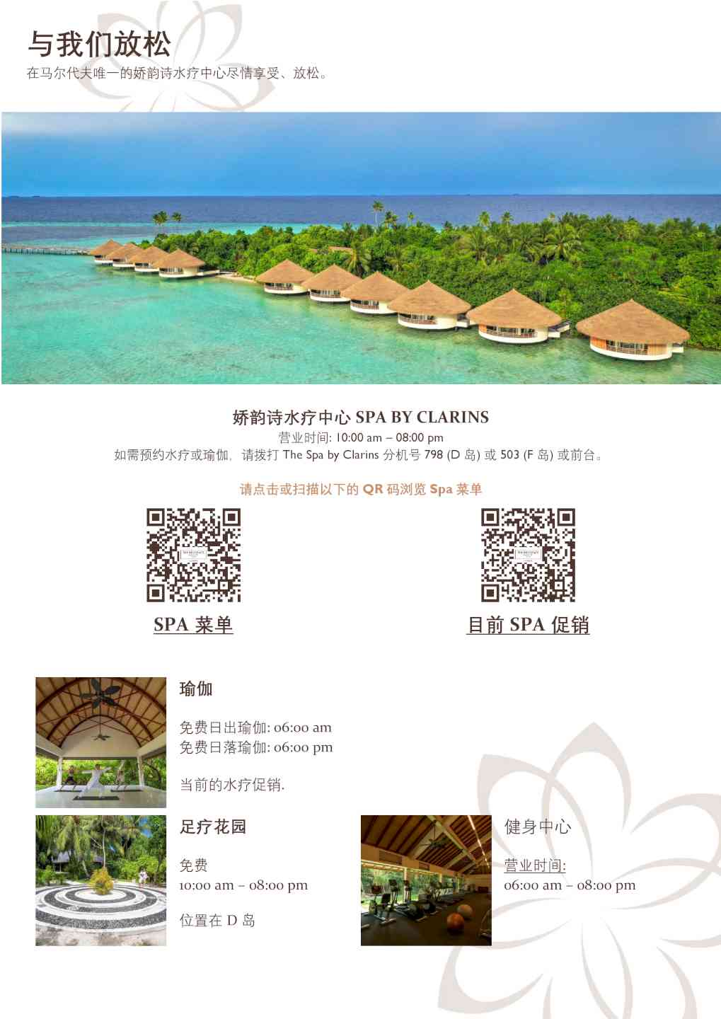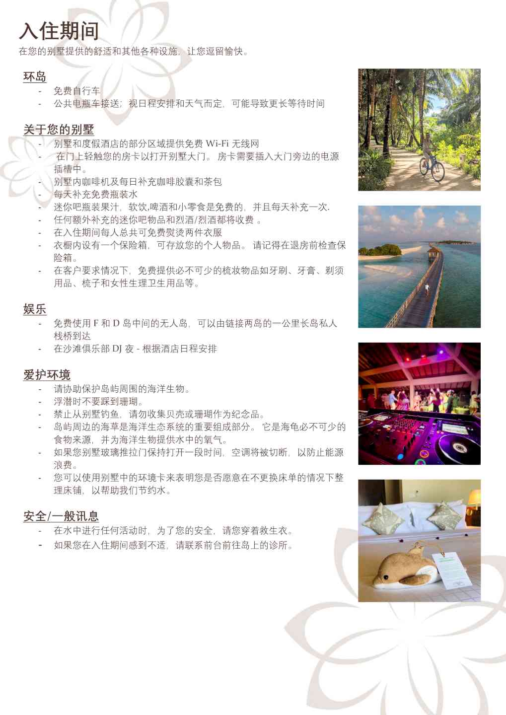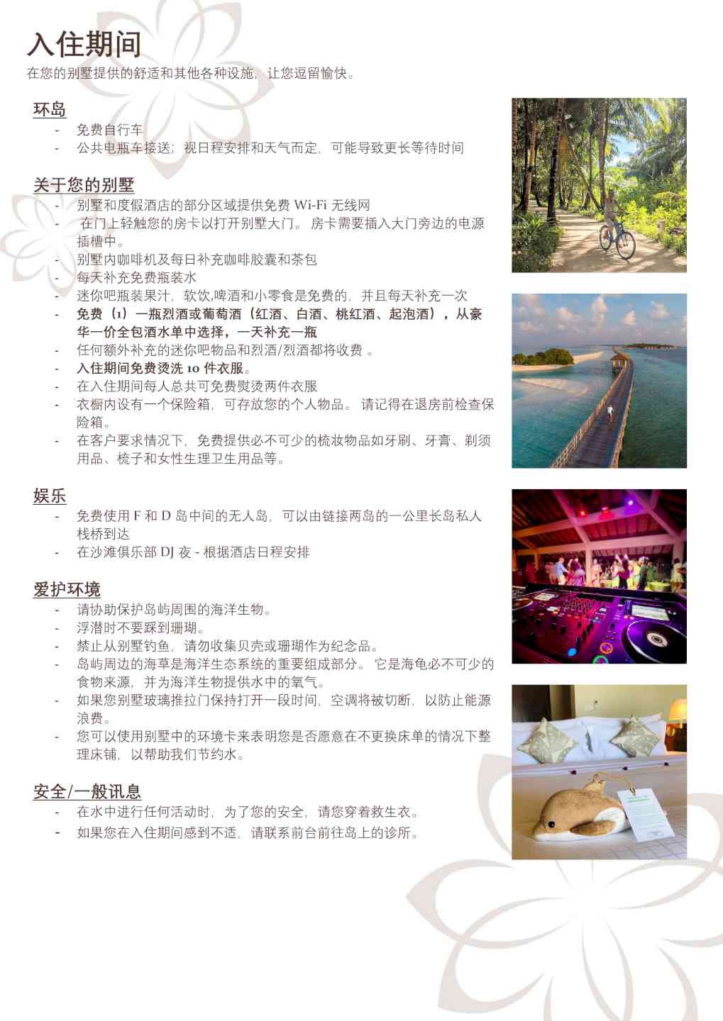 -潜水中心的免费导游房礁浮潜游览活动(每周三次,需预订) -在娇韵诗SPA中心免费日出和日落瑜伽课 -入住4晚及以上,在入住期间赠送每人90分钟日落海豚巡游一次(需预订且受限于天气情况,无现金价值和替代活动)