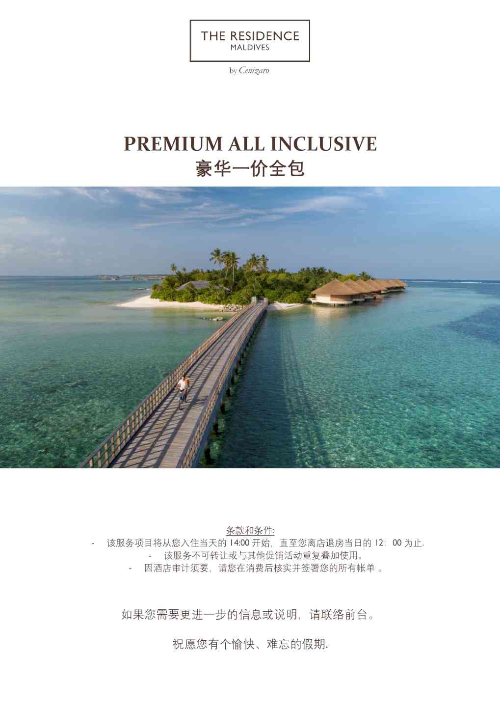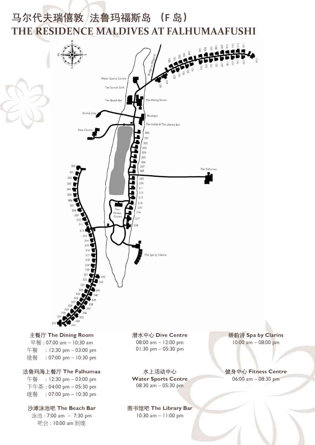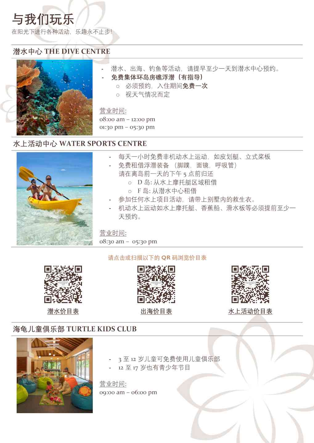 -潜水中心的免费导游房礁浮潜游览活动(每周三次,需预订) -在娇韵诗SPA中心免费日出和日落瑜伽课 -入住4晚及以上,在入住期间赠送每人90分钟日落海豚巡游一次(需预订且受限于天气情况,无现金价值和替代活动)