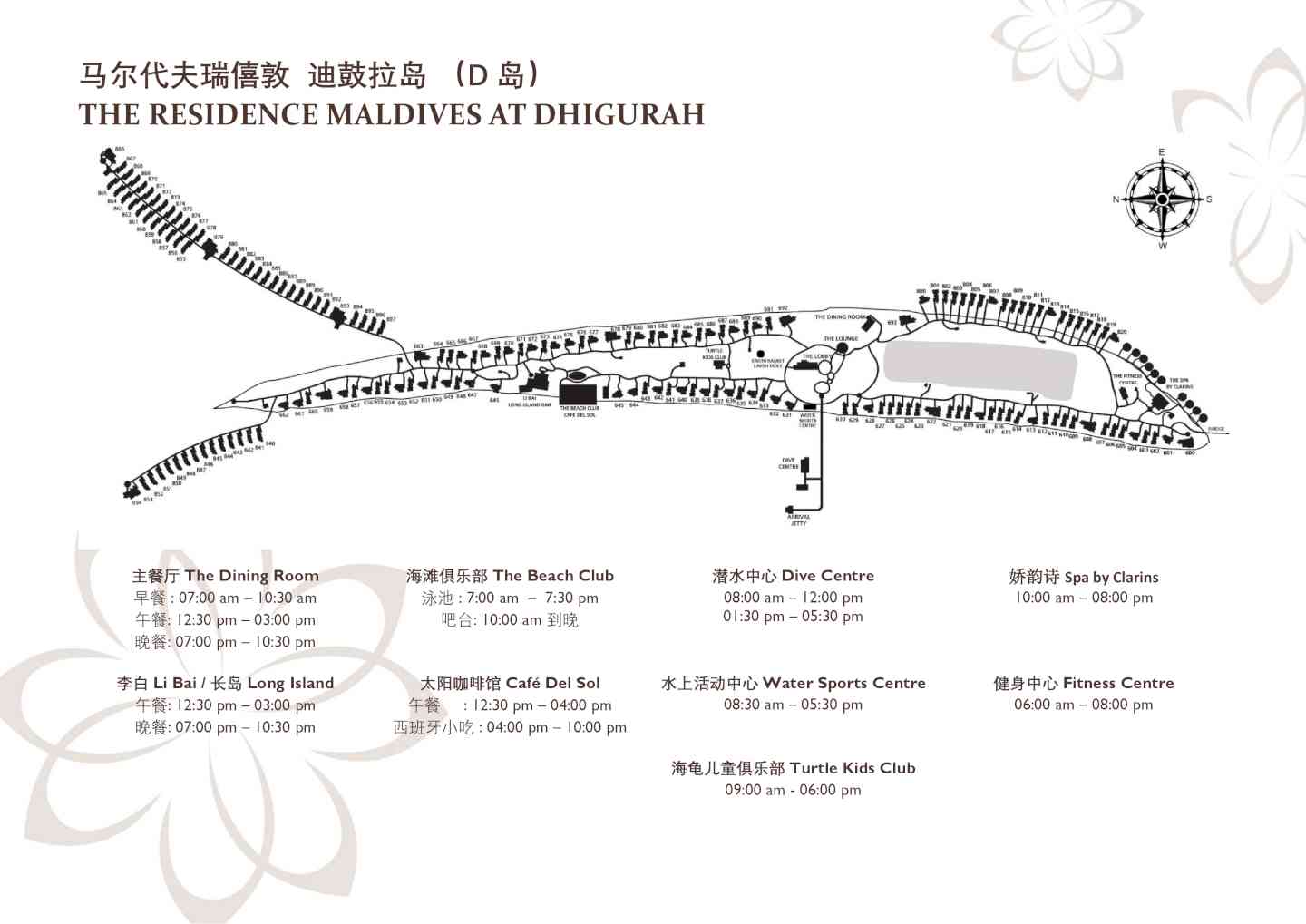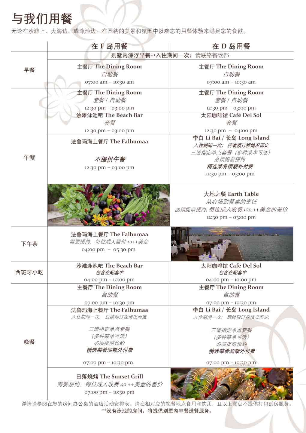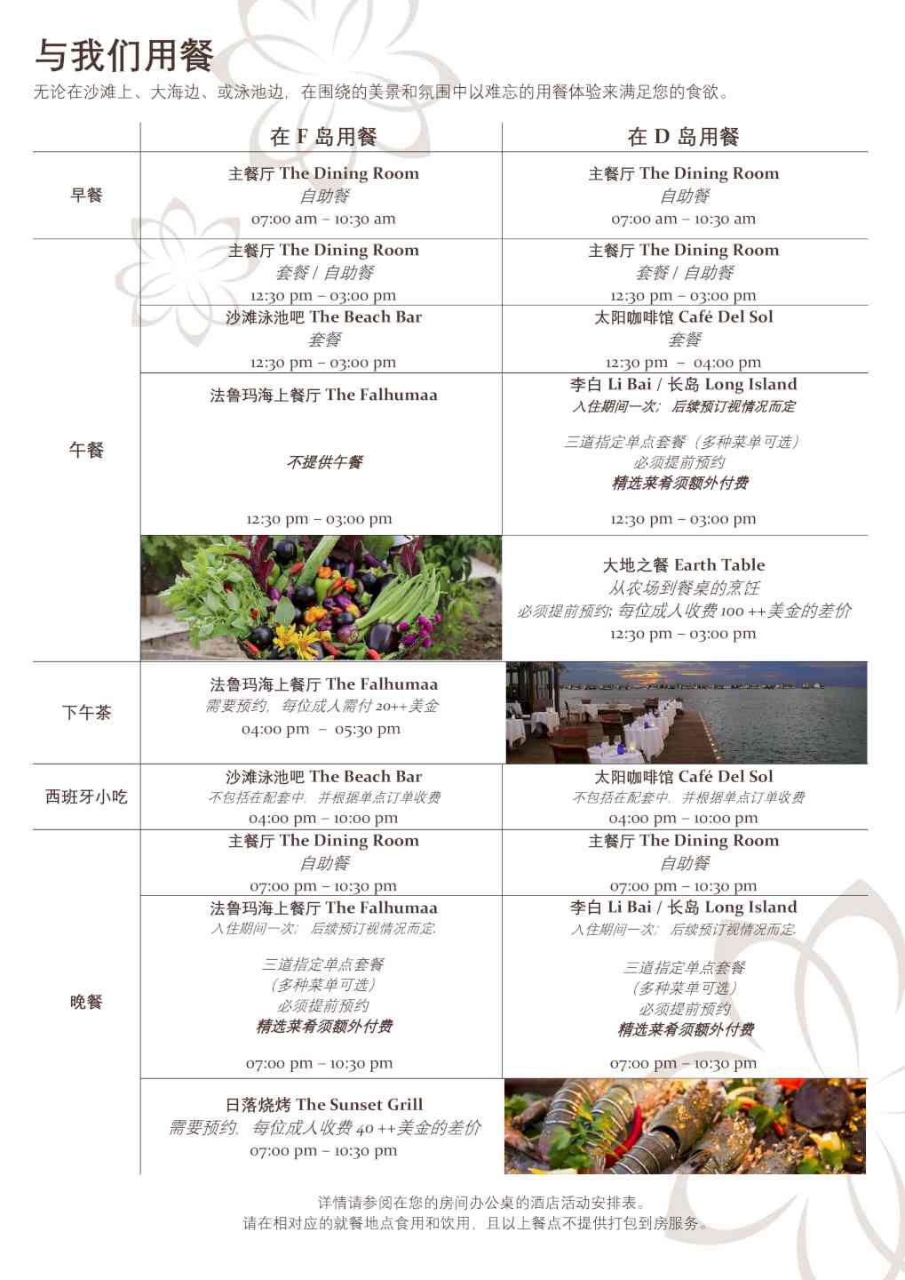 您可以在双岛用餐任意用餐 在瑞喜敦迪古拉岛 -早餐 选择1 主餐厅The Dining Room 自助餐 选择2 别墅内漂浮早餐(入住期间一次,需预约) -午餐 选择1 主餐厅The Dining Room 套餐/自助餐 选择2 太阳咖啡馆 Cafe Del Sol 套餐 选择3 李白餐厅LI Bai 或 长岛酒吧 Long Island A. 三道菜套餐(入住期间一次,需预约) B. 单点午餐(需预约,需额外付费) 选择4 大地之餐Earth Table 农场到餐桌烹饪班(需预约,每位成人收费USD100++) -西班牙小吃 太阳咖啡馆 Cafe Del Sol (不包含,需额外付费) -晚餐 选择1 主餐厅The Dining Room 自助餐 选择2 李白餐厅LI Bai 或 长岛酒吧 Long Island A. 三道菜套餐(入住期间一次,需预约) B. 单点午餐(需预约,需额外付费)