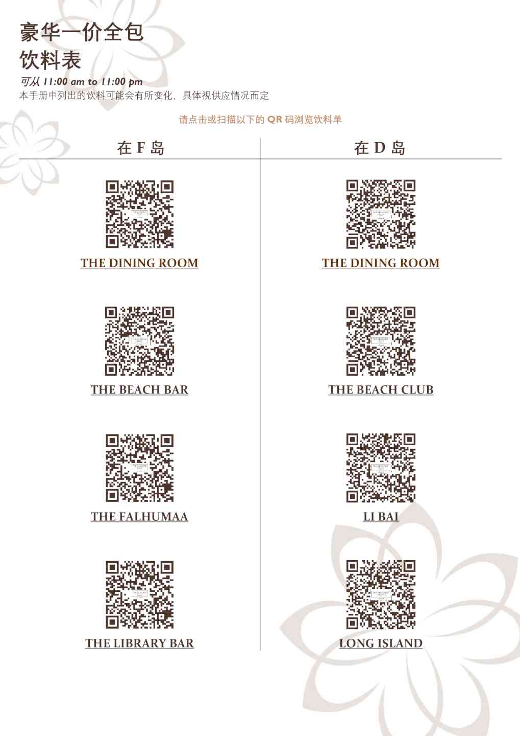 -无限量扎啤、杯装限选酒、限选烈酒、限选鸡尾酒在沙滩俱乐部或餐厅,11:00-23:00。 -无限量扎啤、杯装限选酒、限选烈酒、限选鸡尾酒在长岛酒吧,17:00-22:00。