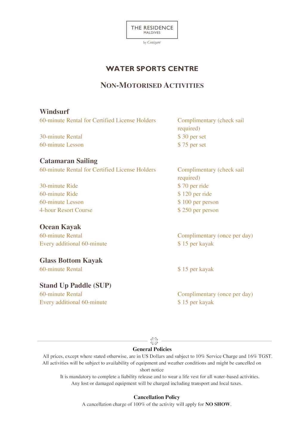 -免费使用设备齐全的健身房 -免费租用非机动水上运动设备,如皮划艇,独立踩踏(不含课程费) 风帆冲浪和双体船需要出示有效驾驶许可证 -3至12岁儿童可免费使用儿童俱乐部,日常活动和游戏时间为10:00 am- 05:30 pm。额外提供婴儿计费托管服务。