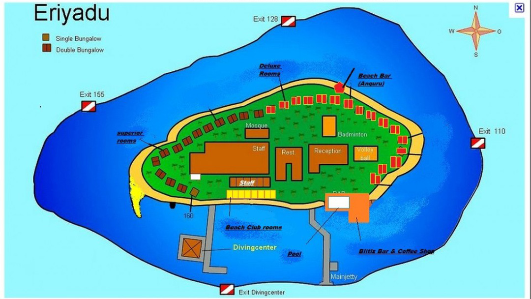 Eriyadu Island Resort 坐落于北马累环礁,距离易卜拉欣·纳西尔国际机场大约46km的地方,快艇上岛约50分钟。岛屿以其沙滩滴落的海滩,色彩缤纷的珊瑚礁和海滩别墅而闻名,是著名的浮潜和潜水胜地。岛屿周边也有众多潜水点,海洋生物丰富,其优越的地理位置使它成为马尔代夫一个令人向往的住宿选择。
