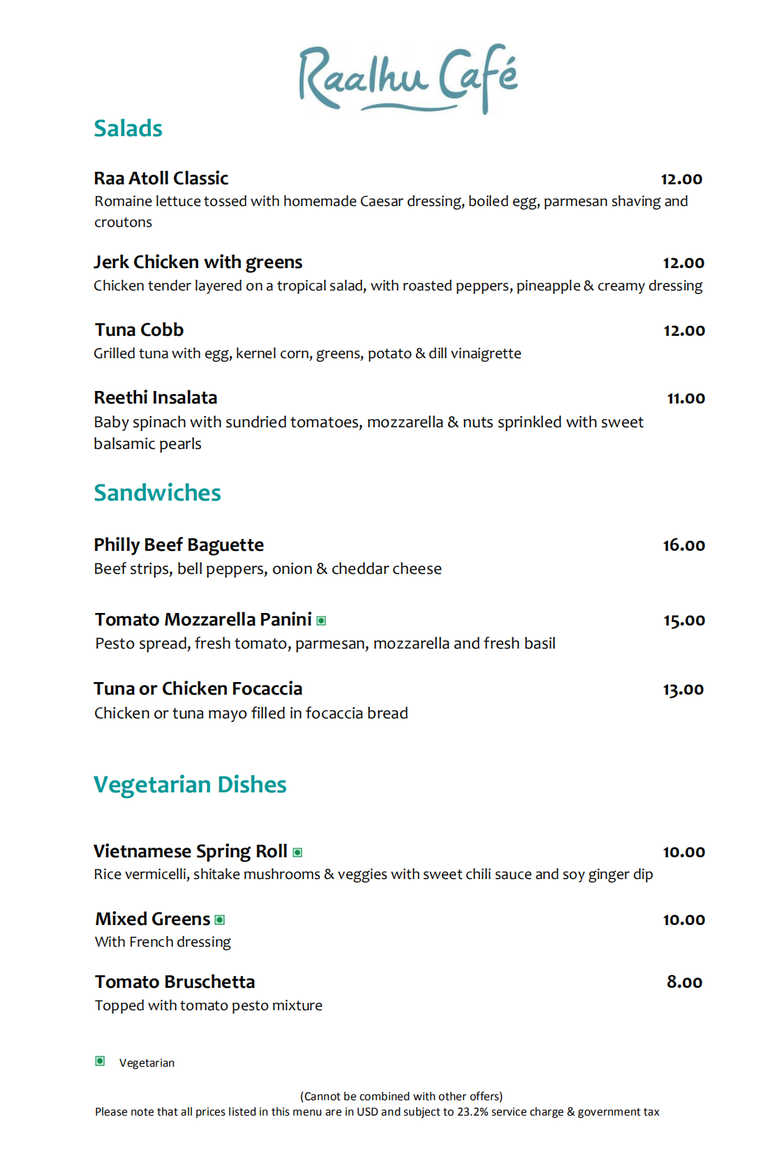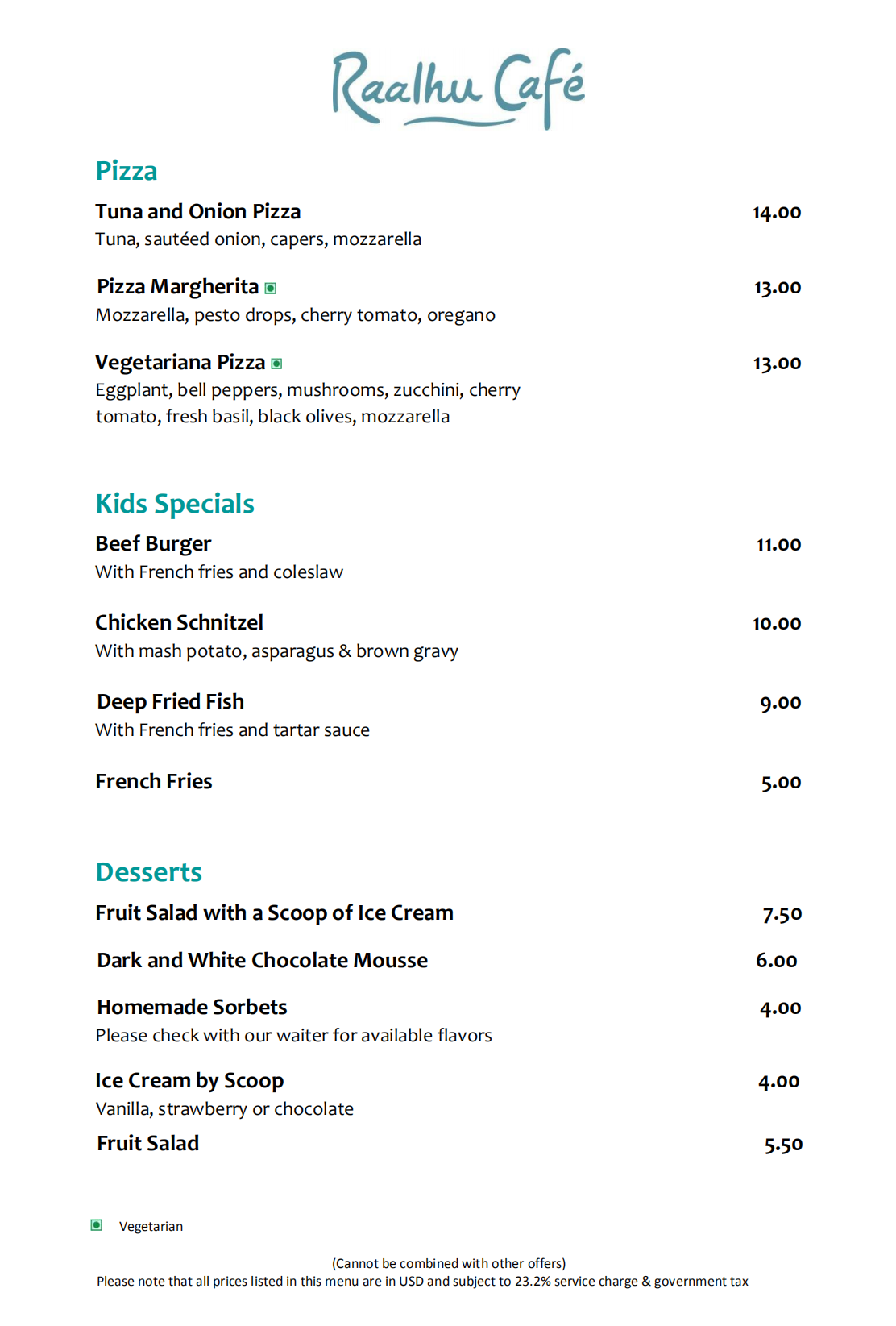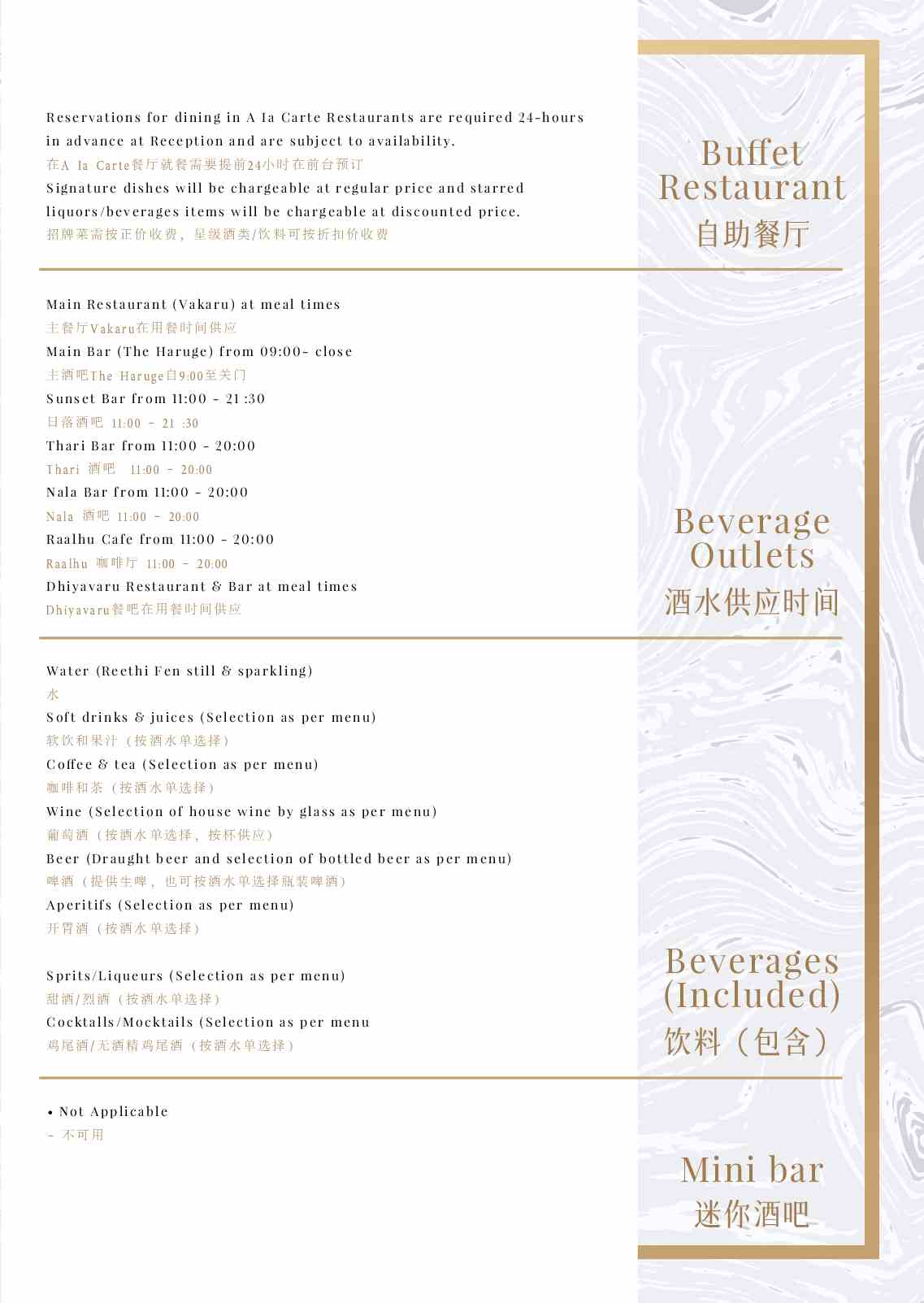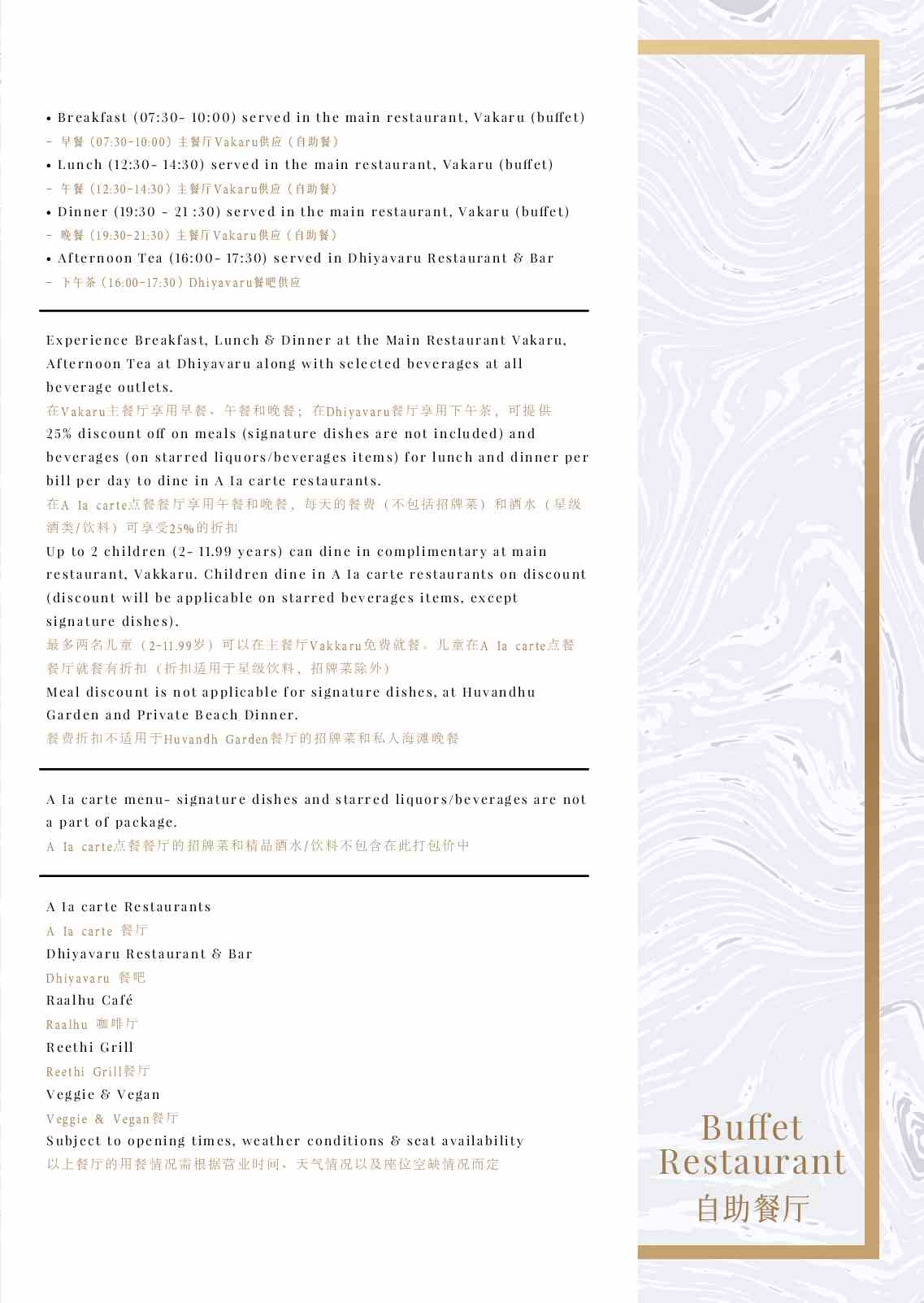 -早餐(07:30-10:00)主餐厅Vakaru供应(自助餐) -午餐(12:30-14:30)主餐厅Vakaru供应(自助餐) -晚餐(19:30-21:30)主餐厅Vakaru供应(自助餐) -在点餐餐厅(Raalhu咖啡厅、Reethi Grill烧烤餐厅、Veggie & Vegan餐厅)享用午餐和晚餐,每天的餐食(不包括招牌菜)和酒水(星级酒类和饮料)可享75折优惠 -最多两名儿童(2-11.99岁)可以在主餐厅Vakaru免费就餐。儿童在点餐餐厅就餐有折扣(折扣不包含招牌菜,但适用于星级饮料) -餐费折扣不适用于Huvandh Garden餐厅的招牌菜和私人海滩晚餐