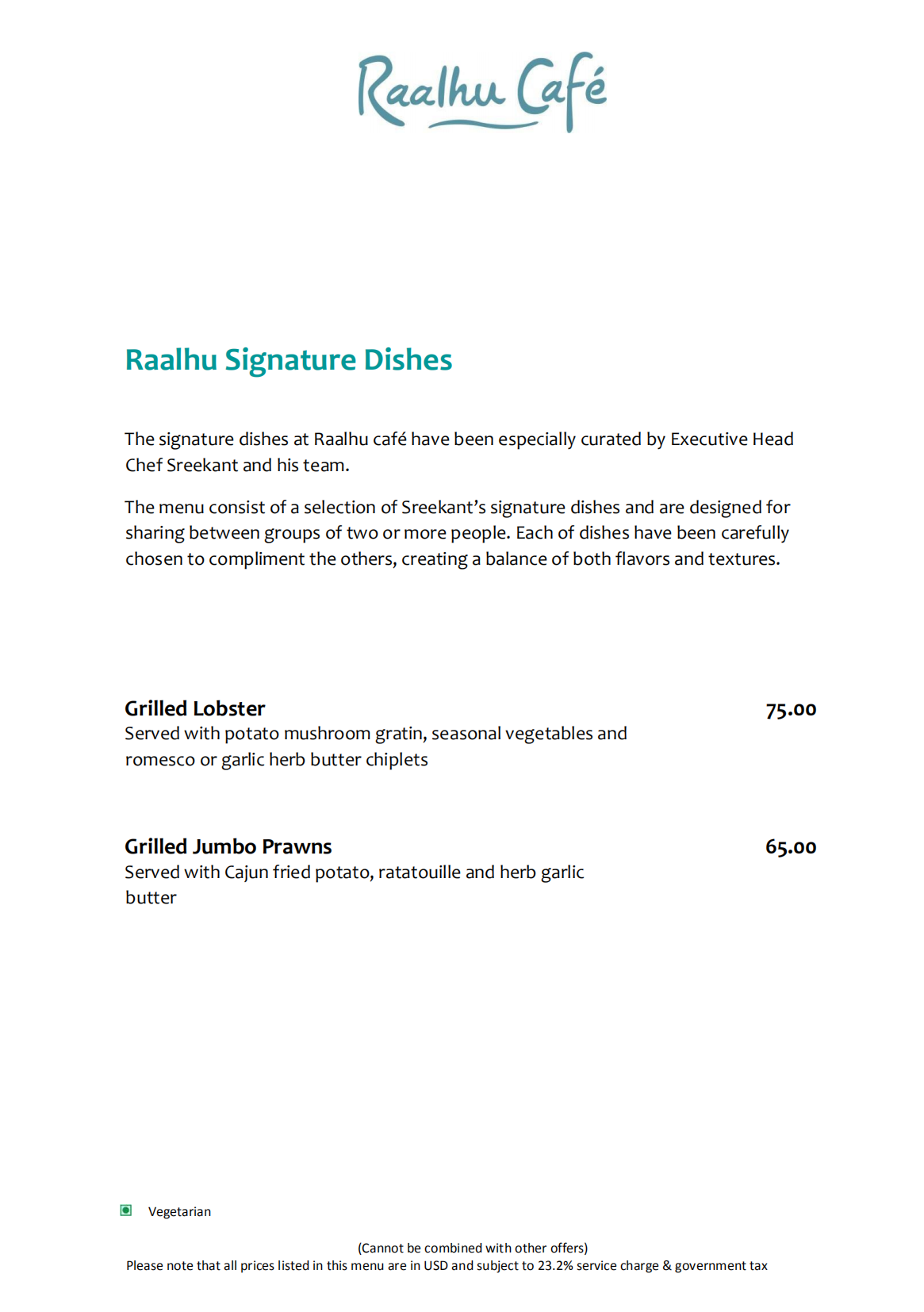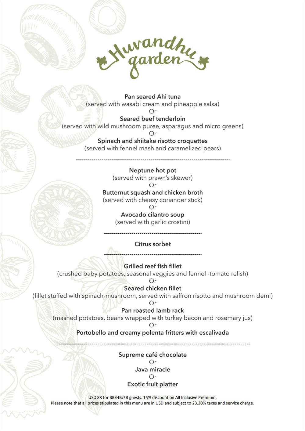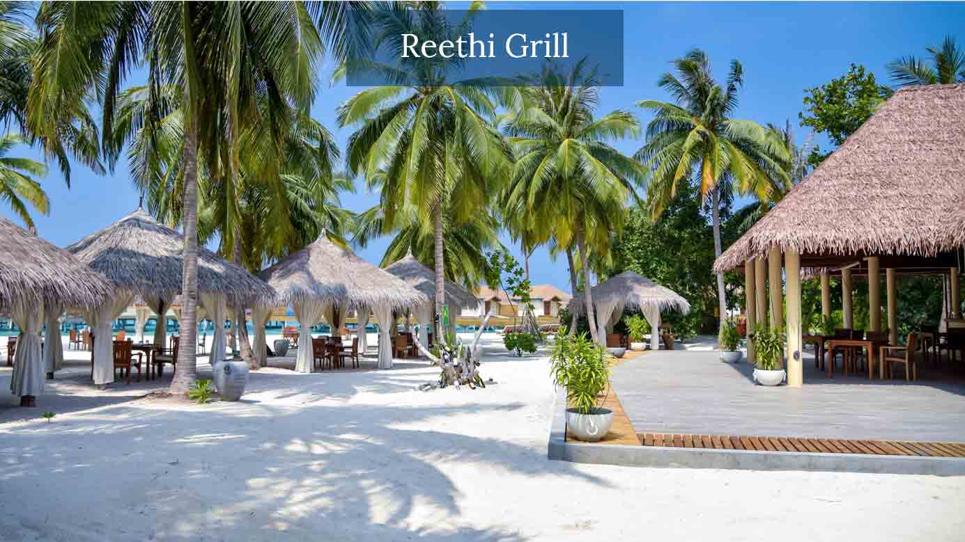-早餐(07:30-10:00)主餐厅Vakaru供应(自助餐) -午餐(12:30-14:30)主餐厅Vakaru供应(自助餐) -晚餐(19:30-21:30)主餐厅Vakaru供应(自助餐) -在点餐餐厅(Raalhu咖啡厅、Reethi Grill烧烤餐厅、Veggie & Vegan餐厅)享用午餐和晚餐,每天的餐食(不包括招牌菜)和酒水(星级酒类和饮料)可享75折优惠 -最多两名儿童(2-11.99岁)可以在主餐厅Vakaru免费就餐。儿童在点餐餐厅就餐有折扣(折扣不包含招牌菜,但适用于星级饮料) -餐费折扣不适用于Huvandh Garden餐厅的招牌菜和私人海滩晚餐