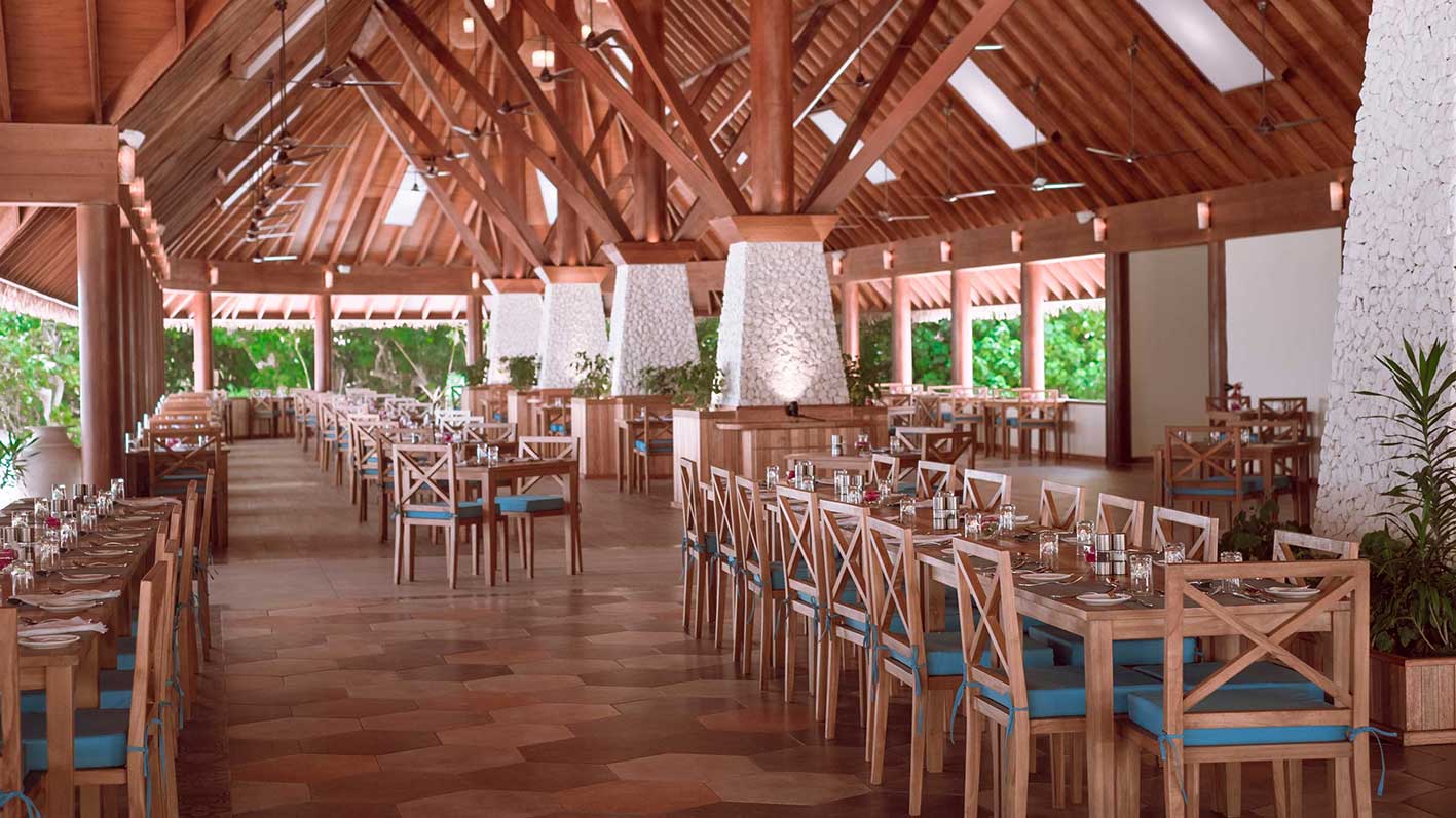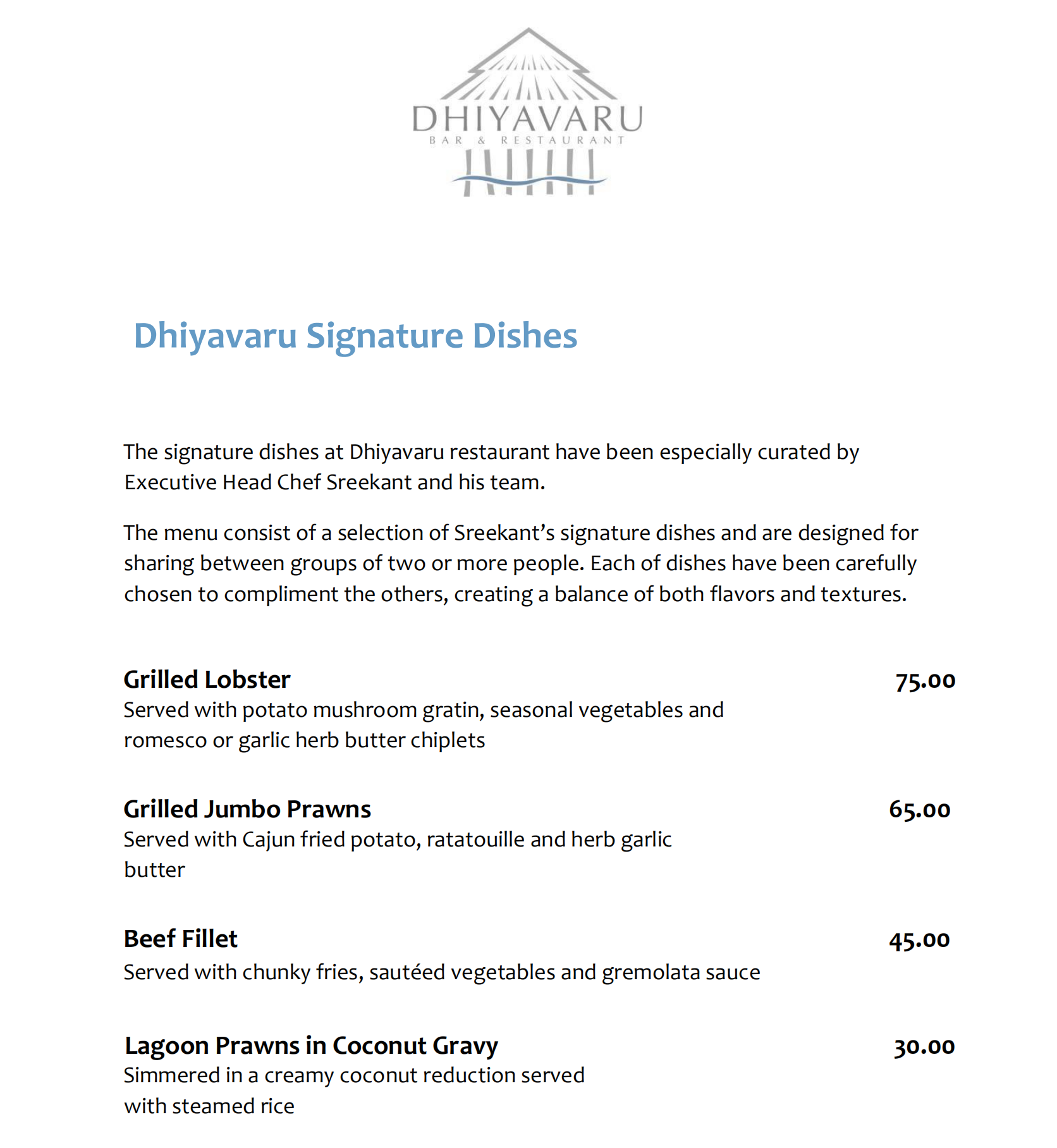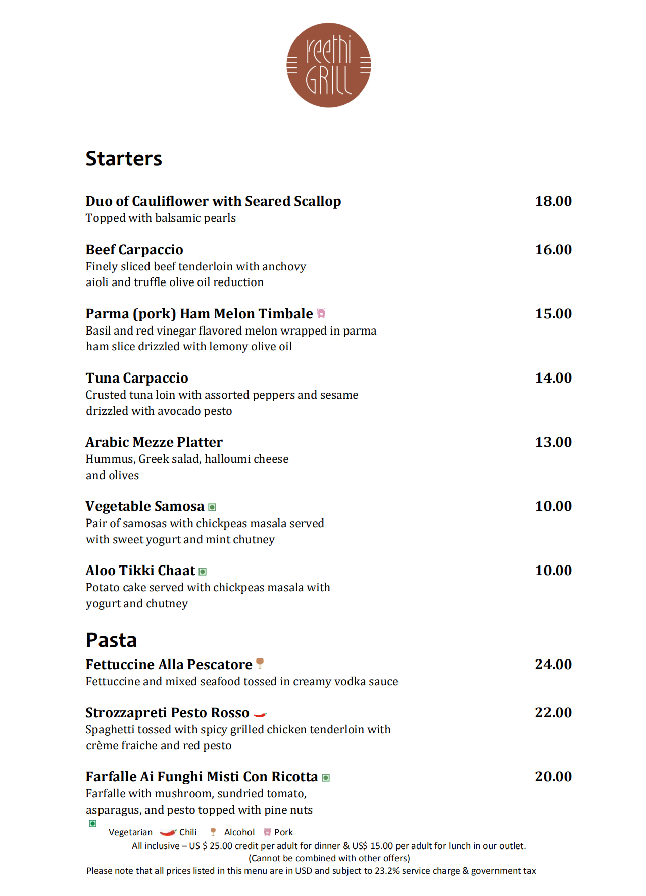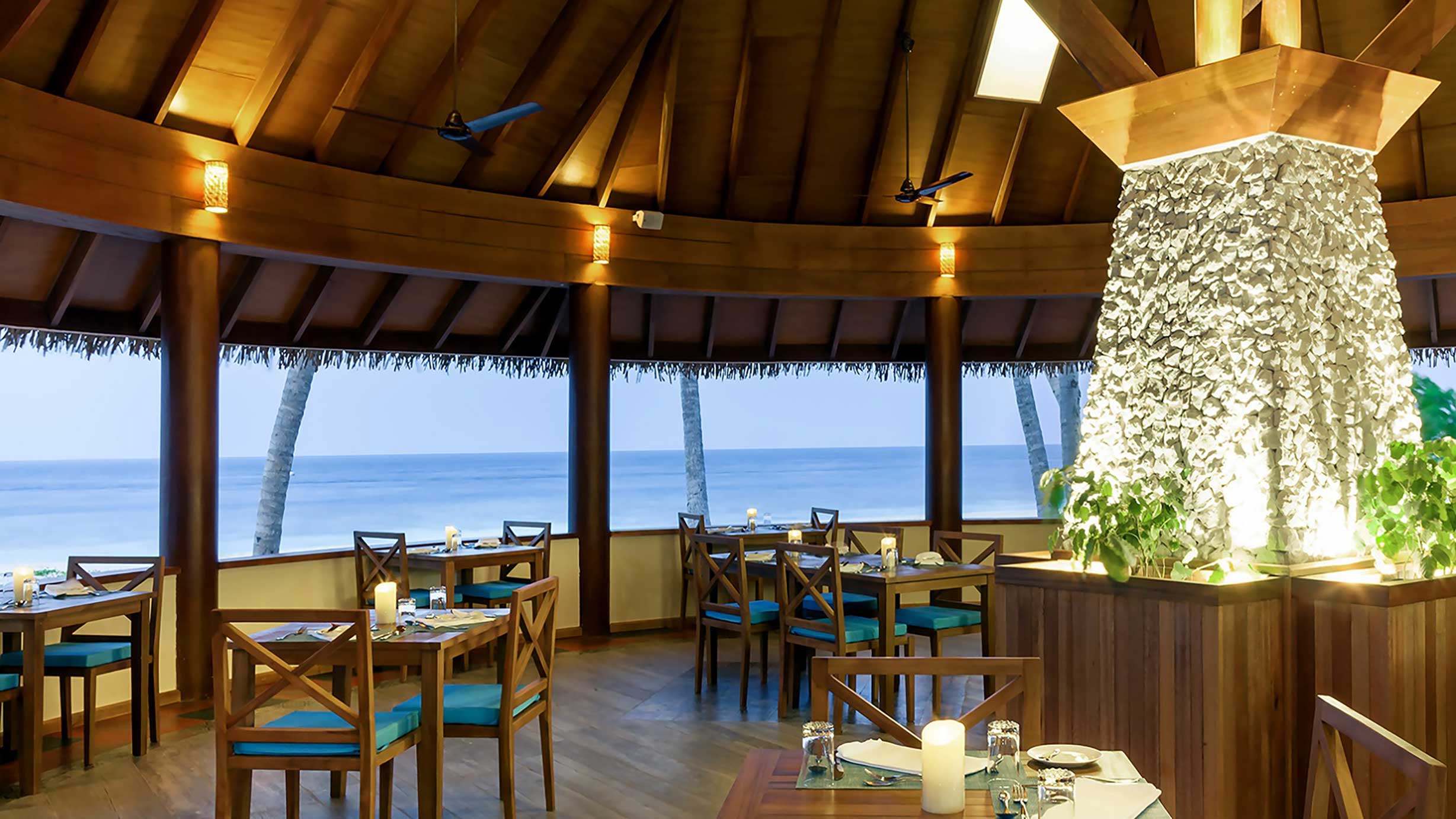 -早餐(07:30-10:00)主餐厅Vakaru供应(自助餐) -午餐(12:30-14:30)主餐厅Vakaru供应(自助餐) -晚餐(19:30-21:30)主餐厅Vakaru供应(自助餐) -在点餐餐厅(Raalhu咖啡厅、Reethi Grill烧烤餐厅、Veggie & Vegan餐厅)享用午餐和晚餐,每天的餐食(不包括招牌菜)和酒水(星级酒类和饮料)可享75折优惠 -最多两名儿童(2-11.99岁)可以在主餐厅Vakaru免费就餐。儿童在点餐餐厅就餐有折扣(折扣不包含招牌菜,但适用于星级饮料) -餐费折扣不适用于Huvandh Garden餐厅的招牌菜和私人海滩晚餐