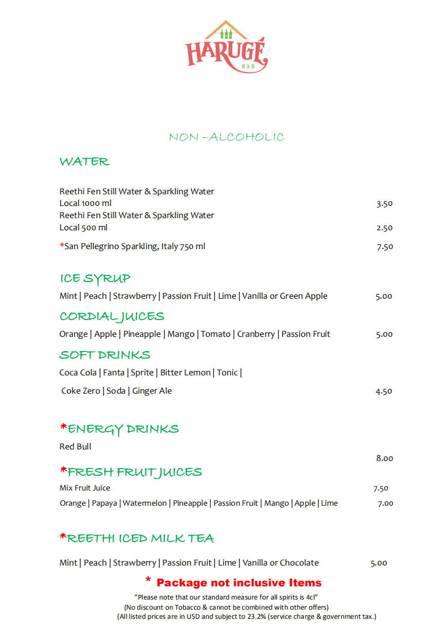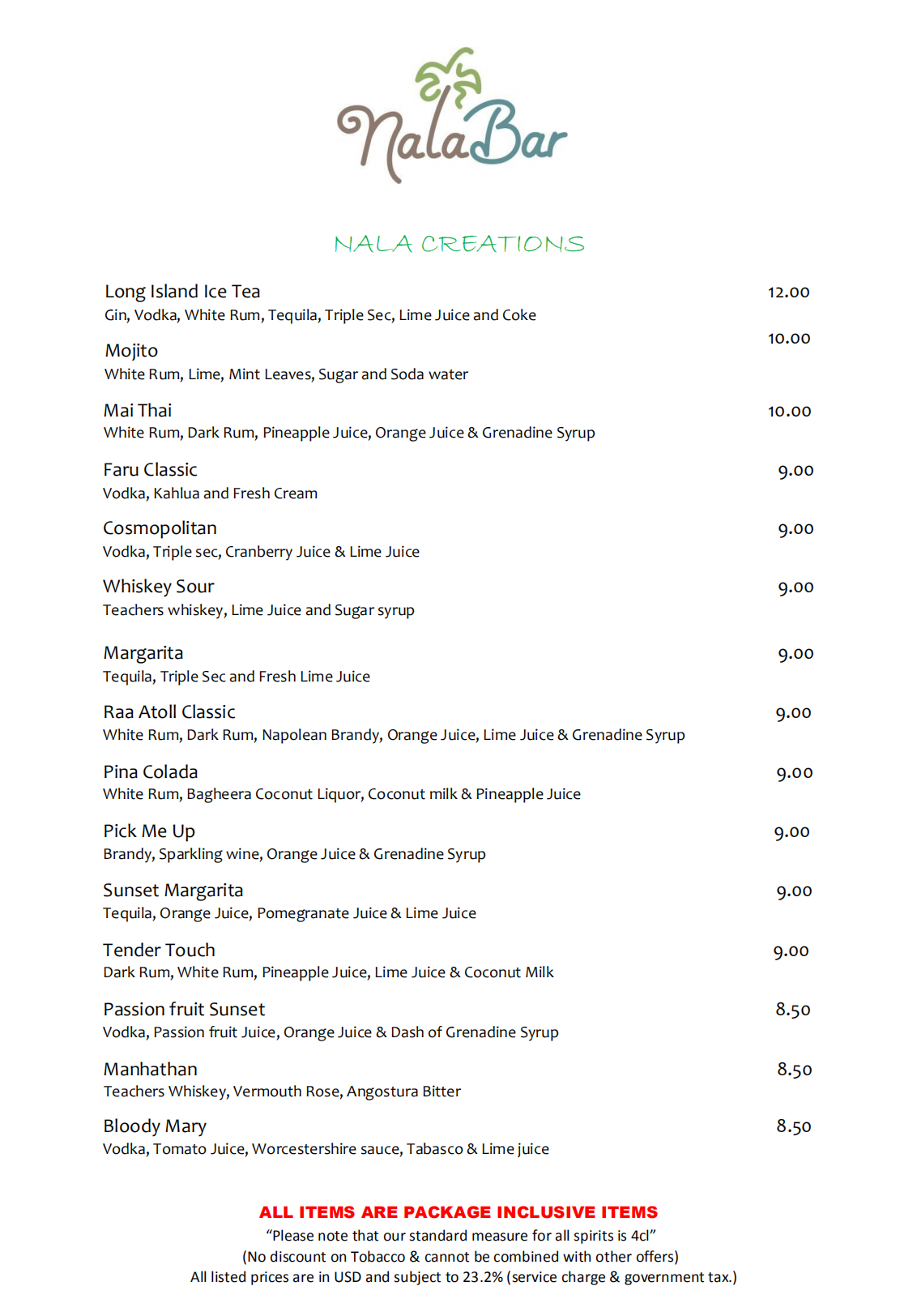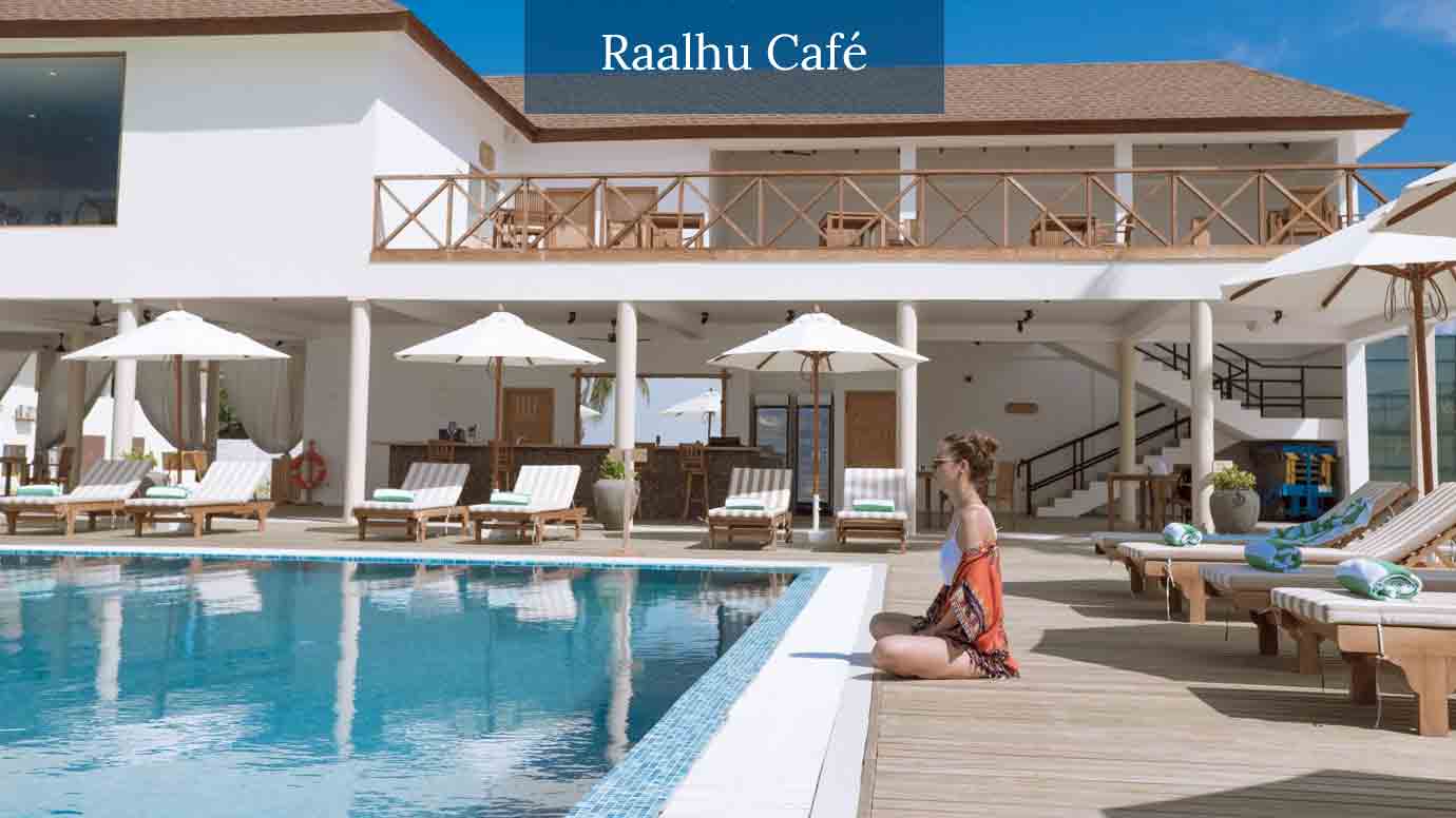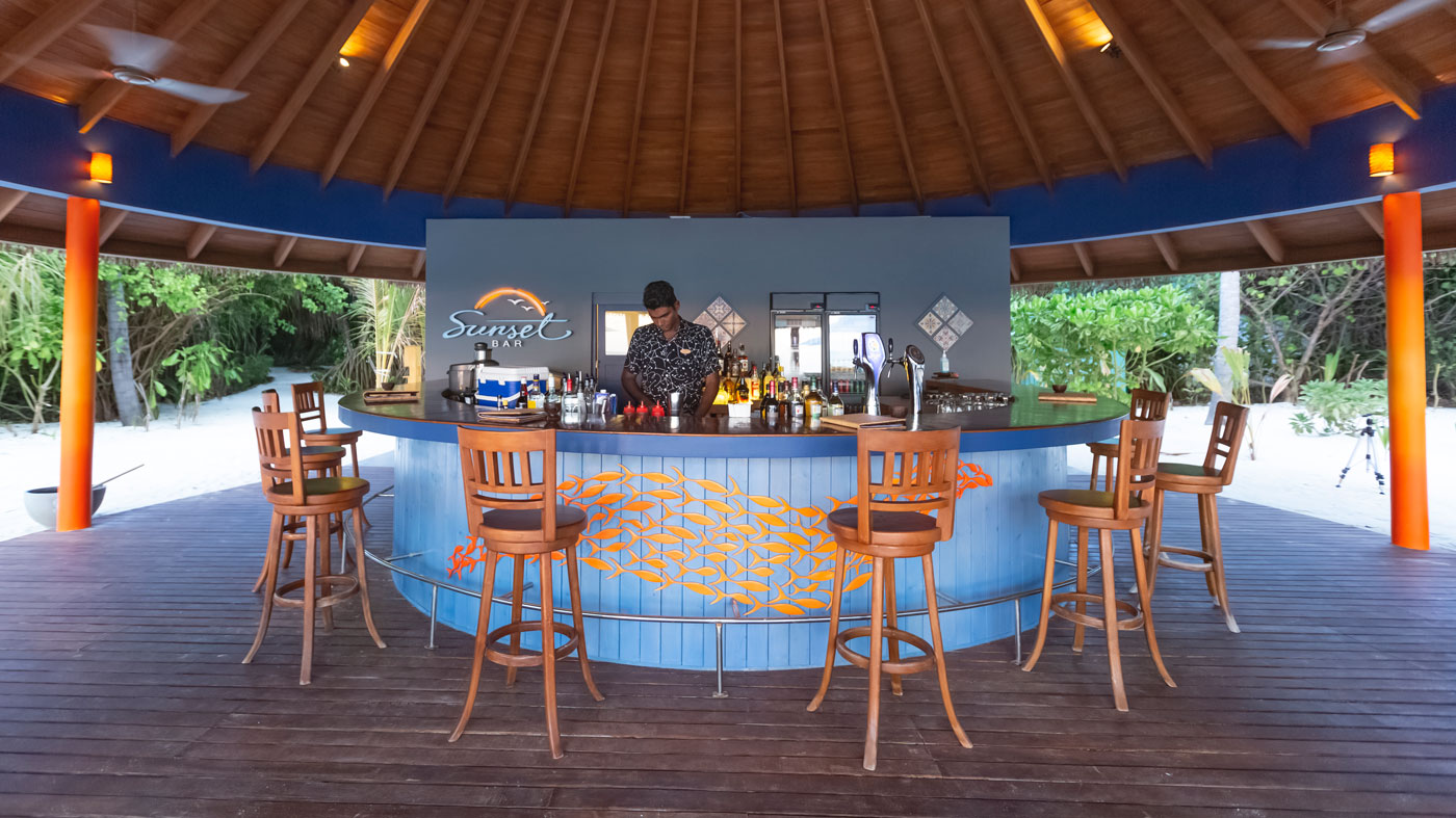 -Dhiyavaru餐吧(用餐时间) -The Haruge Bar The Haruge酒吧(09:00-至最后一位客人离开) -Sunset Bar 日落酒吧(11:00-21:30) -Thari Bar Thari酒吧(11:00-20:00) -Nala Bar Nala酒吧(11:00-20:00) -Raalhu Cafe Raalhu咖啡厅(11:00-20:00) 均提供精选酒水饮料