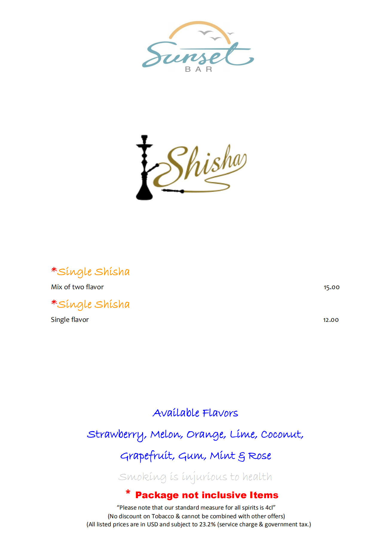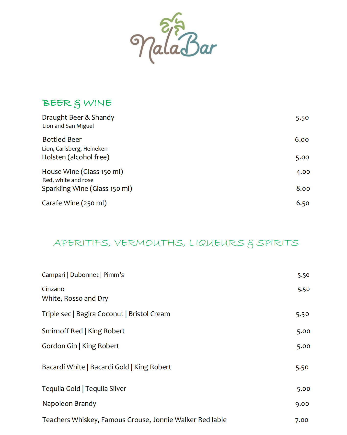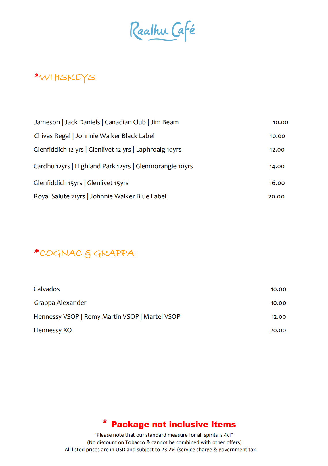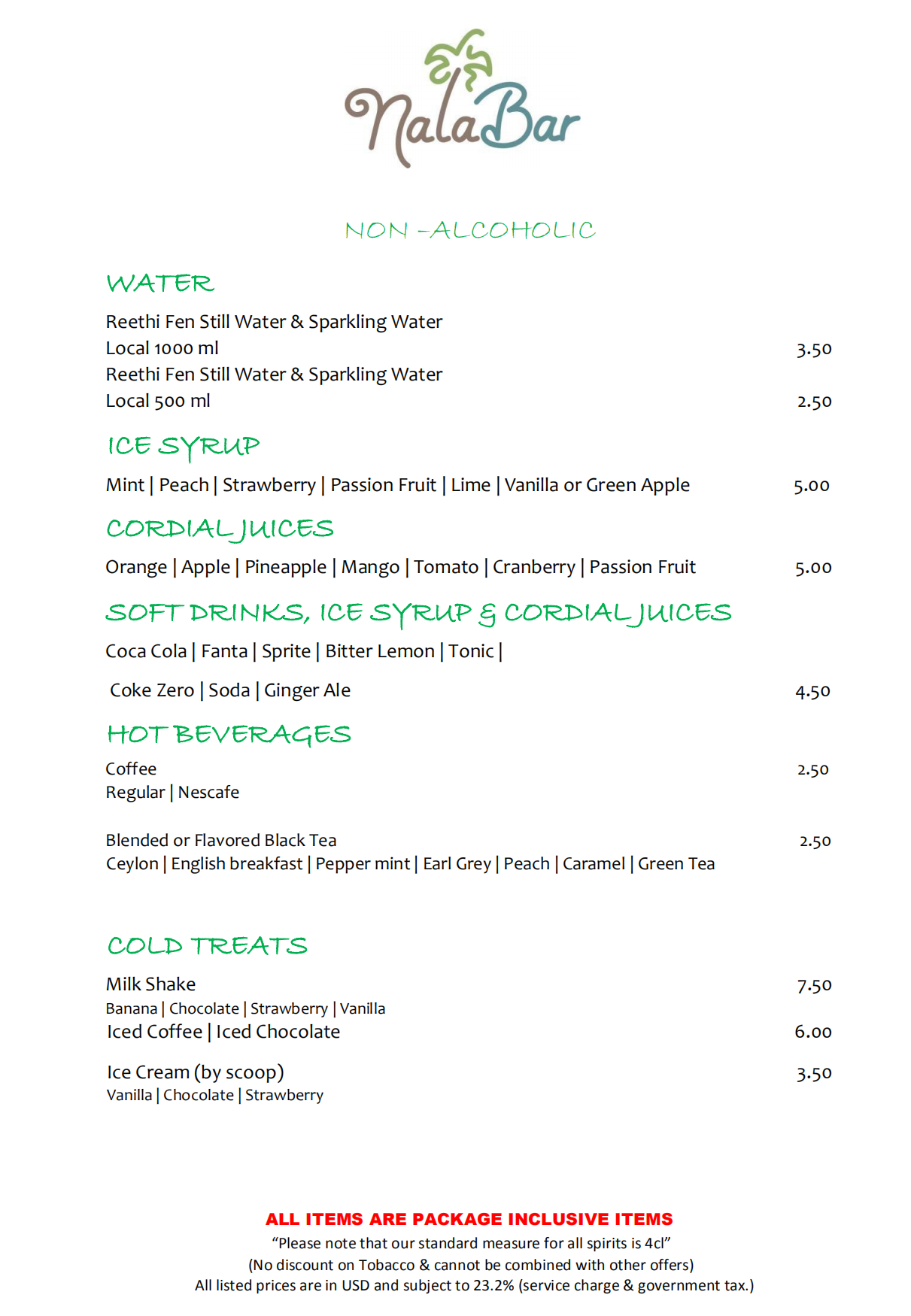 -Dhiyavaru餐吧(用餐时间) -The Haruge Bar The Haruge酒吧(09:00-至最后一位客人离开) -Sunset Bar 日落酒吧(11:00-21:30) -Thari Bar Thari酒吧(11:00-20:00) -Nala Bar Nala酒吧(11:00-20:00) -Raalhu Cafe Raalhu咖啡厅(11:00-20:00) 均提供精选酒水饮料