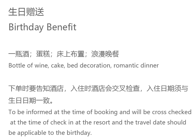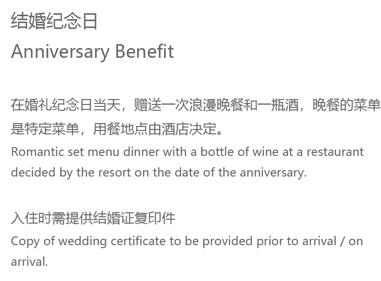 -在餐厅或特别地点(酒店决定,视情况而定)安排一次固定菜单的烛光晚餐,并赠送一瓶葡萄酒,须在抵达时预订
