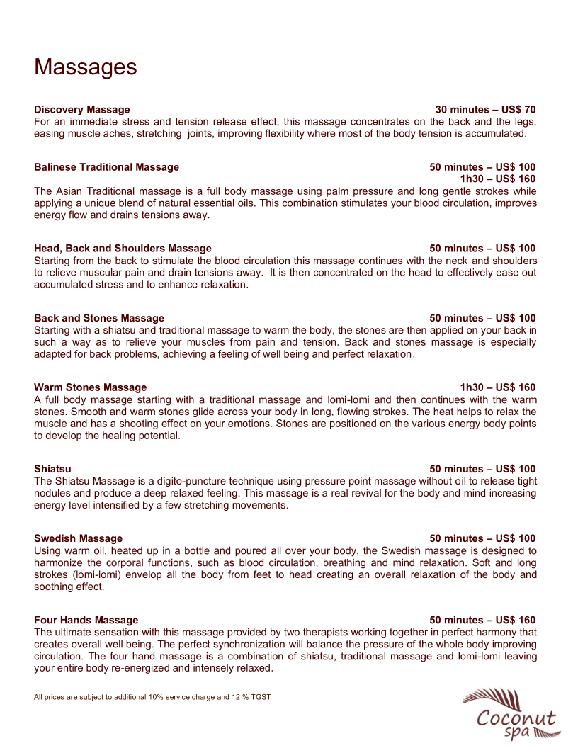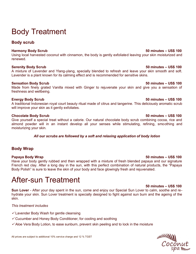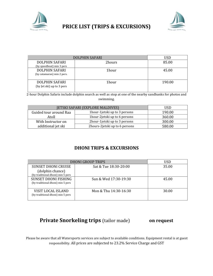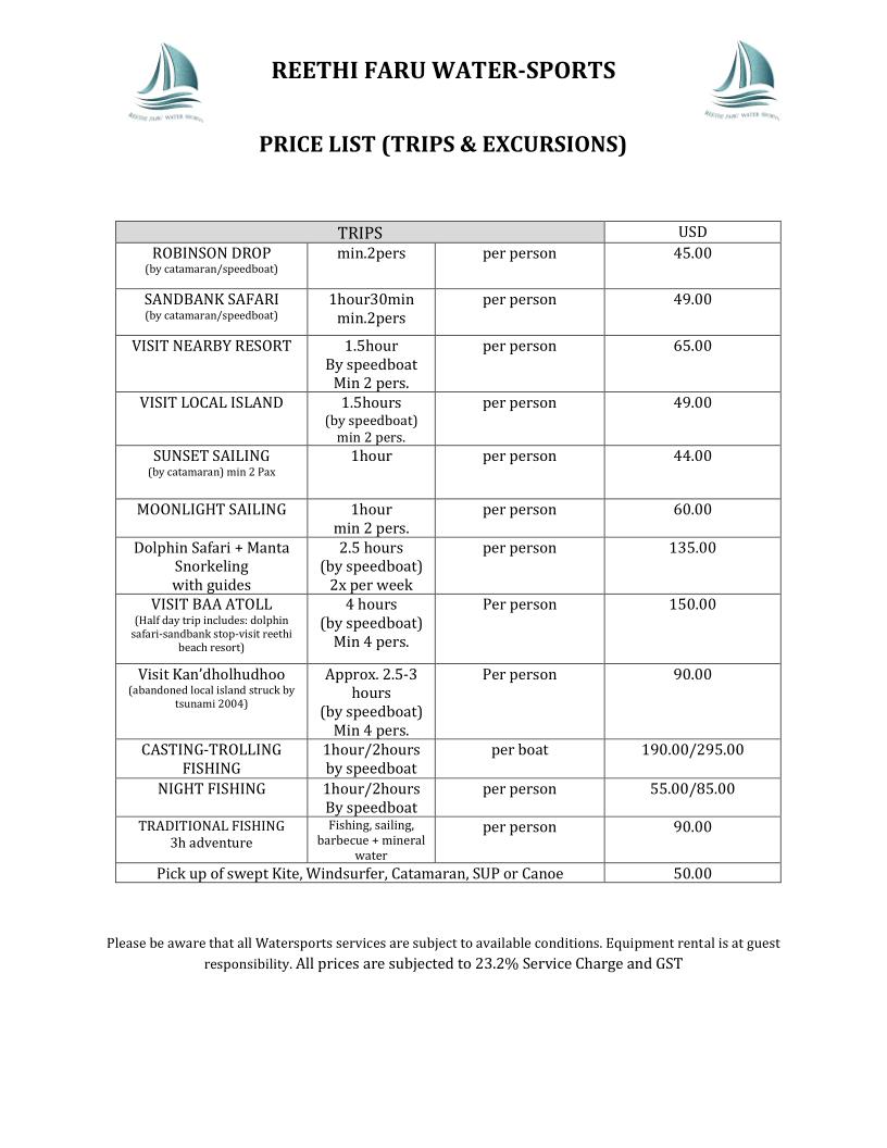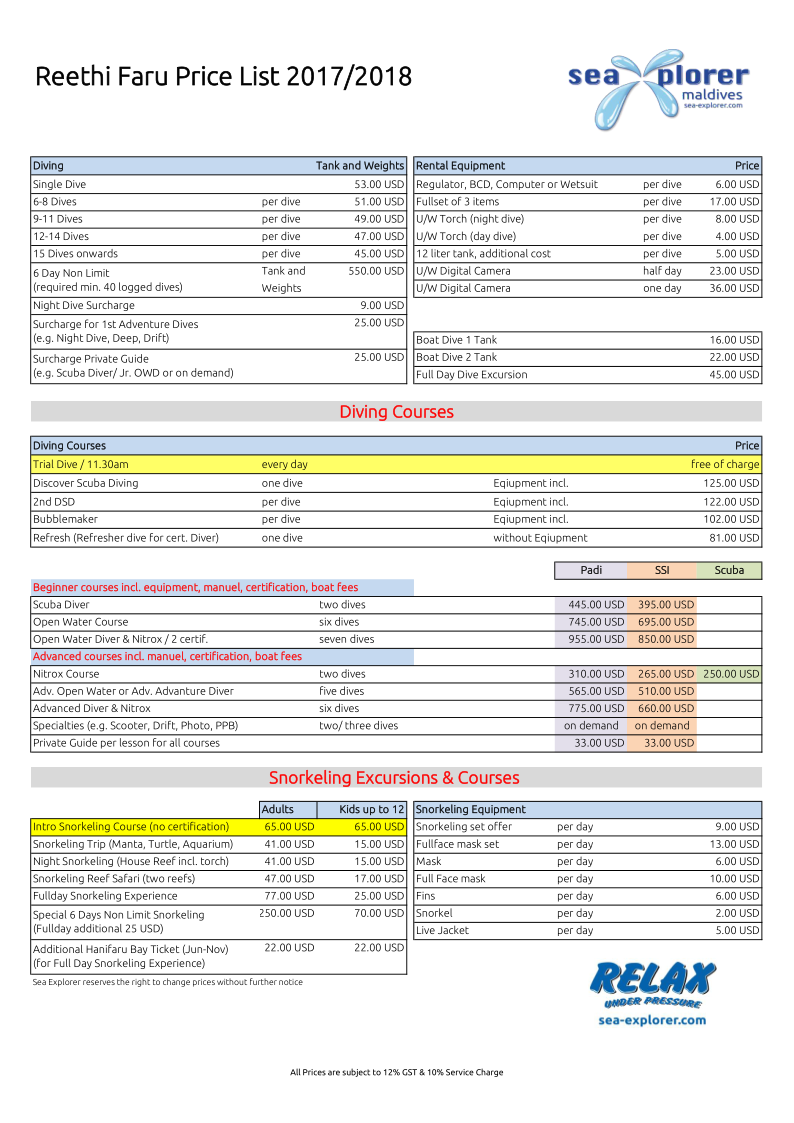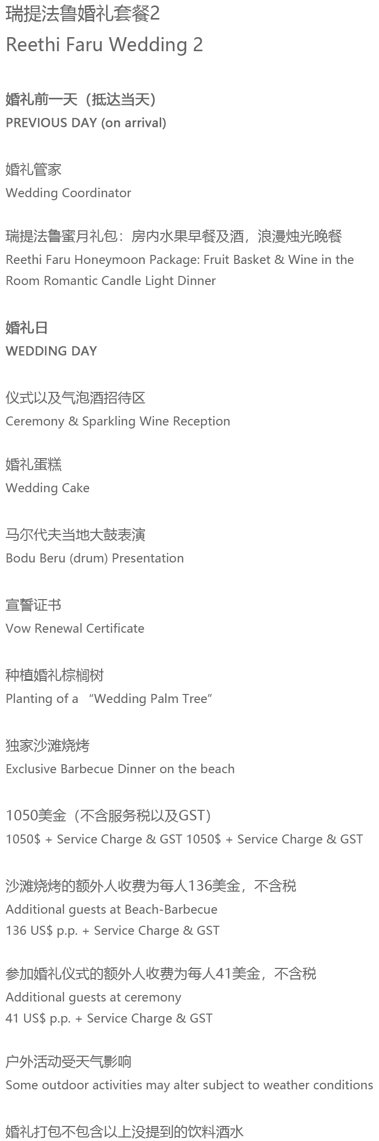 -体育活动 • 瑜伽Nidra (团体课,根据上课人数、酒店安排有所变动) • 网球、壁球、羽毛球(需要预约) • 一套新的网球收费15.00美元 -水上活动项目 • 每人在入住期间可享受2次水上活动(日落dhoni游和透明独木舟),出游受天气条件、管理部门批准,最低人数限制)。 -潜水和浮潜 • 入住期间可享受一次体验潜水(免费,含装备,请联系潜水中心了解详情) • 入住期间可享受一次由导游带领的环礁浮潜之旅(免费,不含装备,请联系潜水中心了解详情)