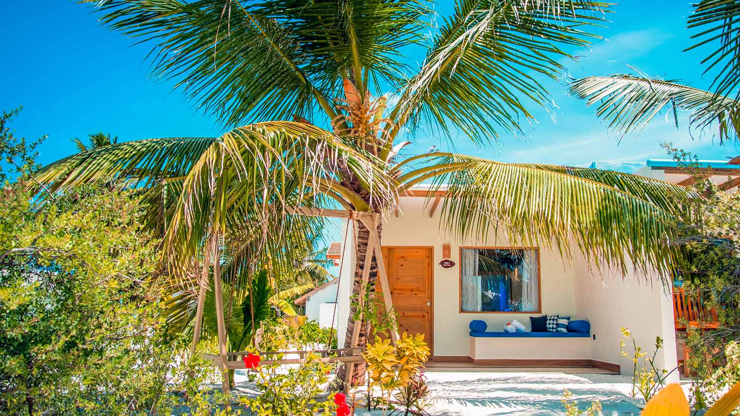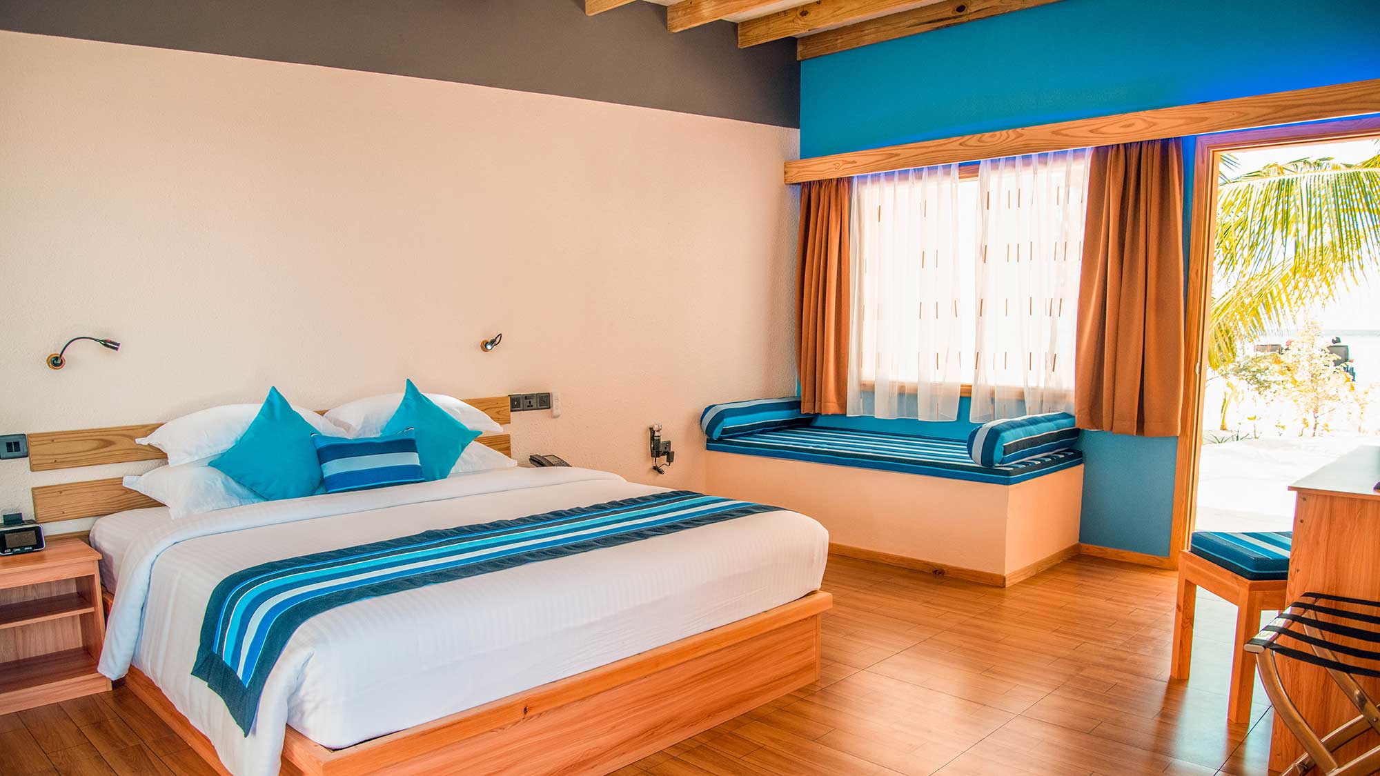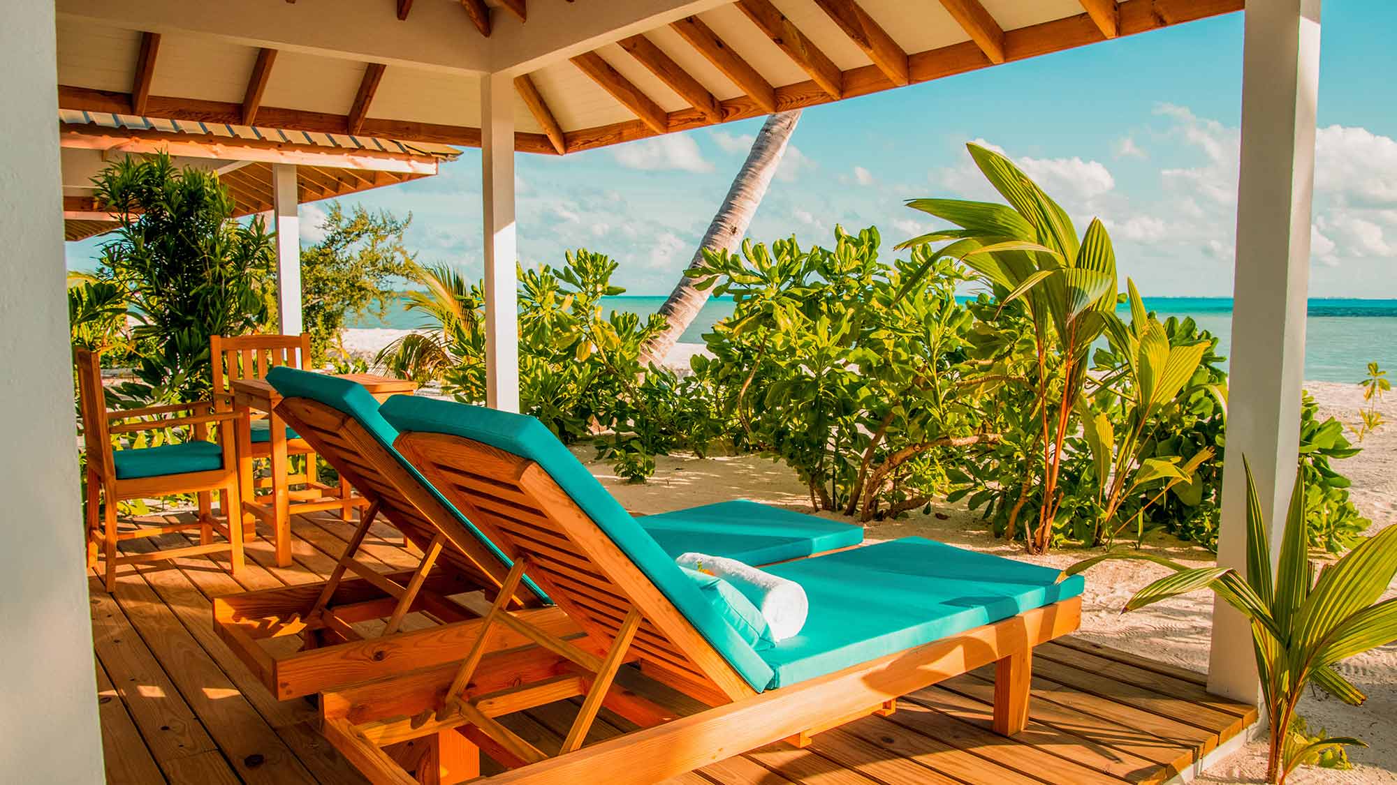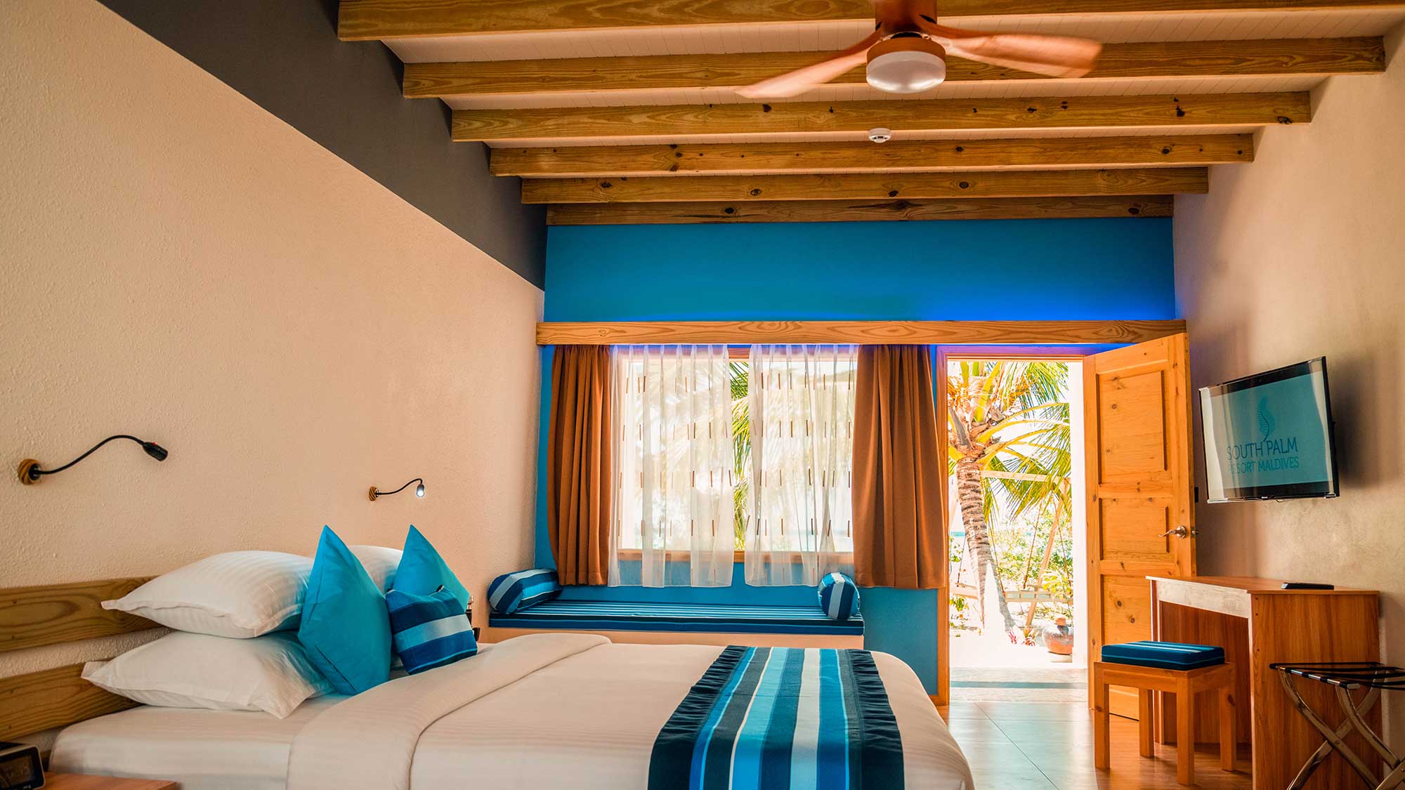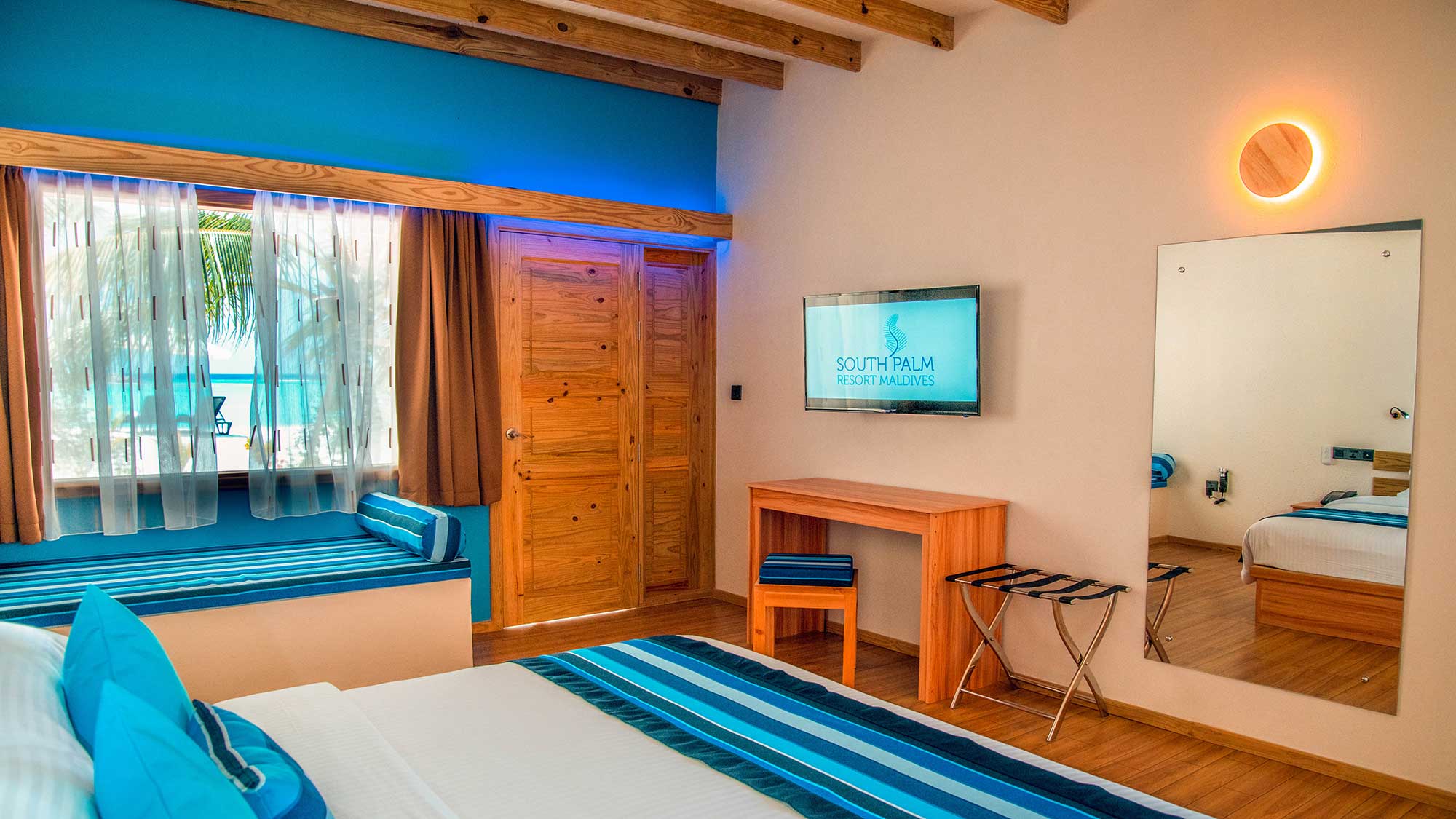 四周环绕着白色的沙滩和清澈的泻湖,享有阿杜环礁宁静的蓝色海景。
