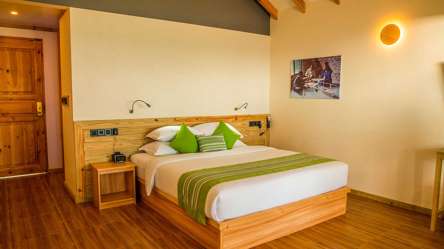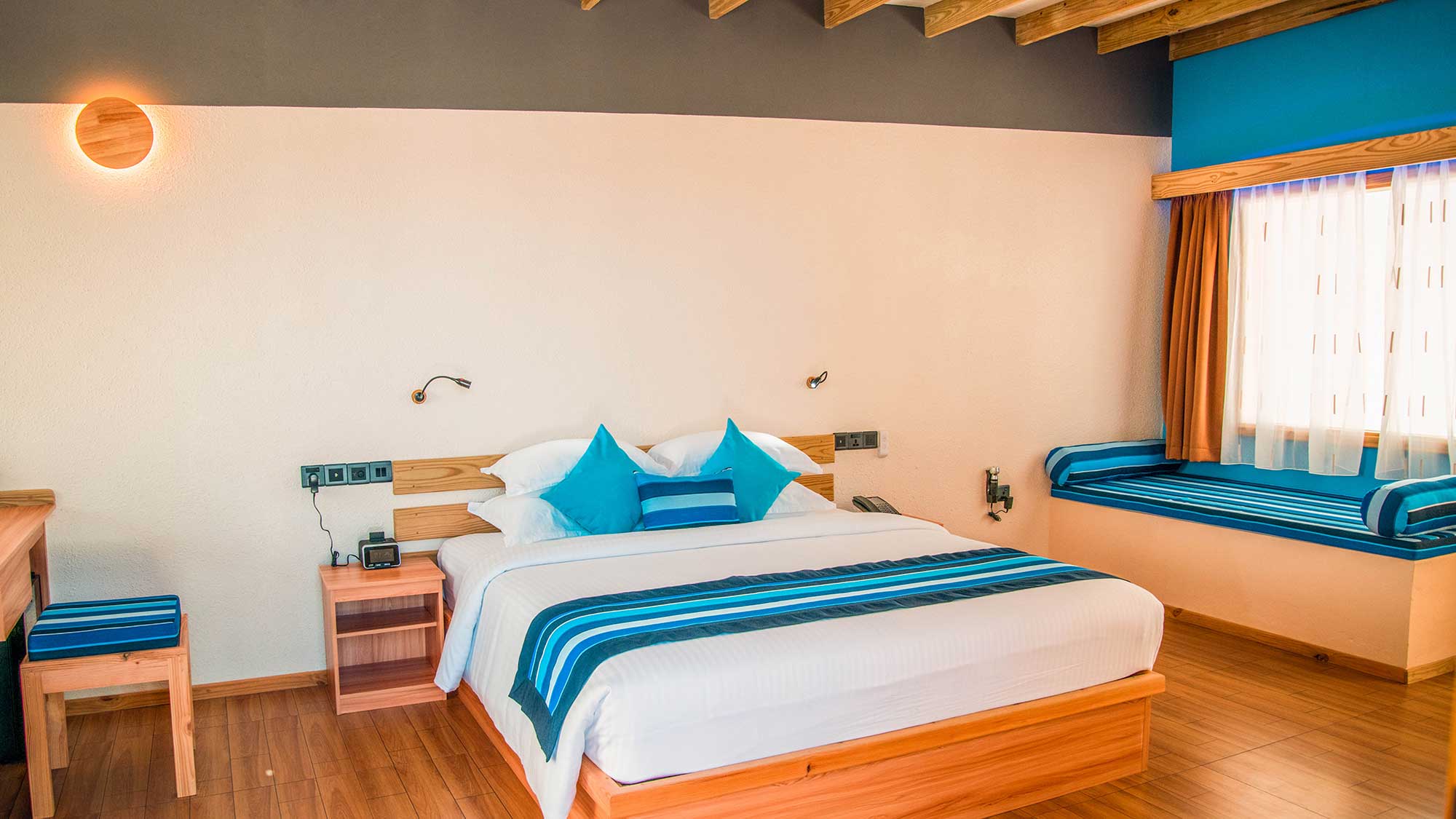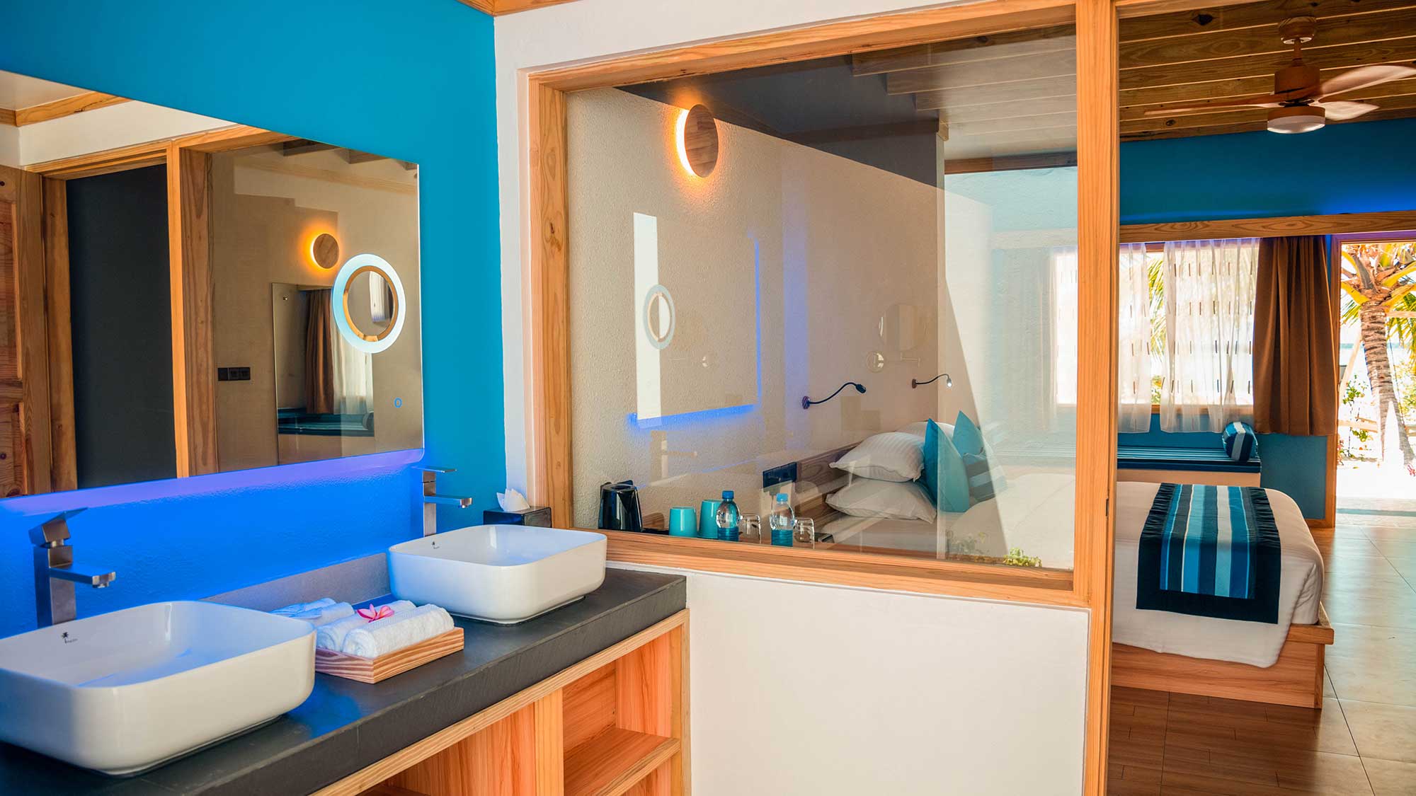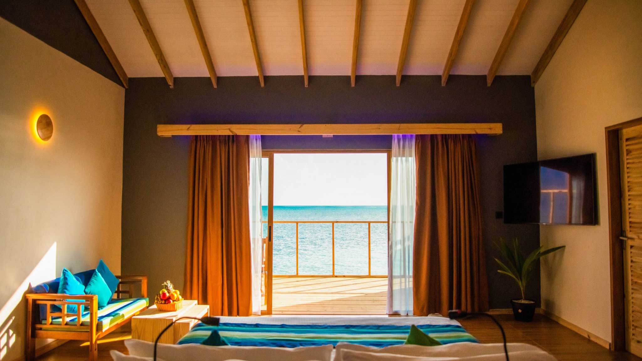 四周环绕着白色的沙滩和清澈的泻湖,享有阿杜环礁宁静的蓝色海景。