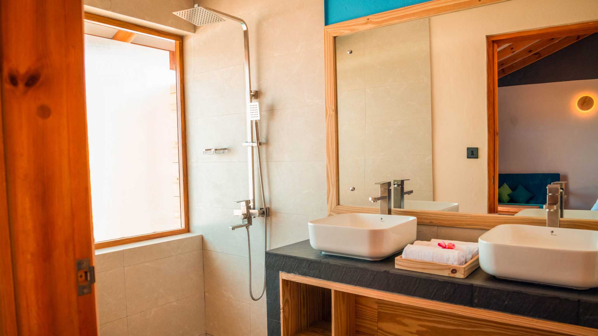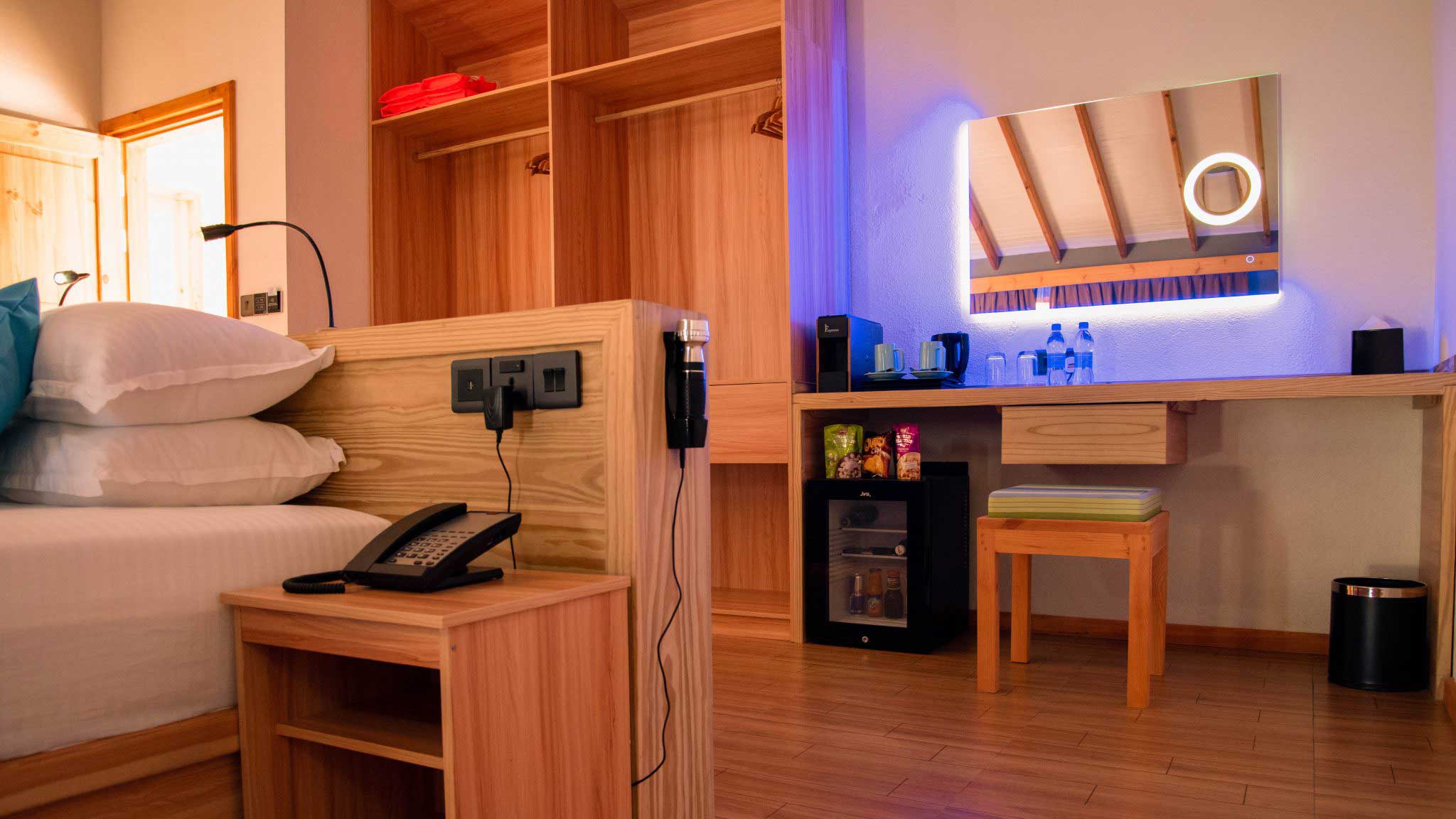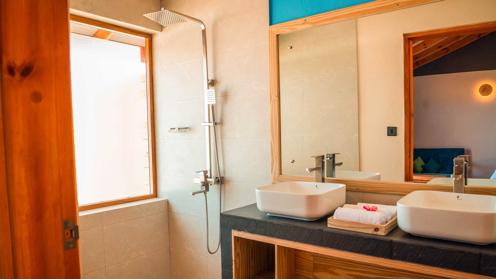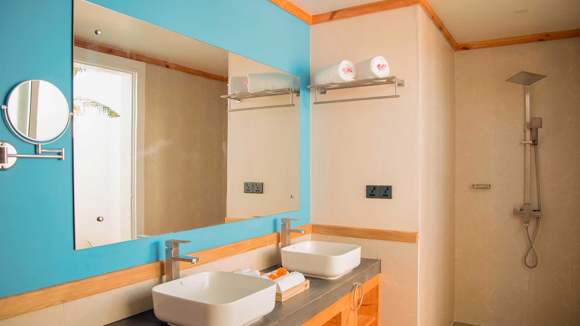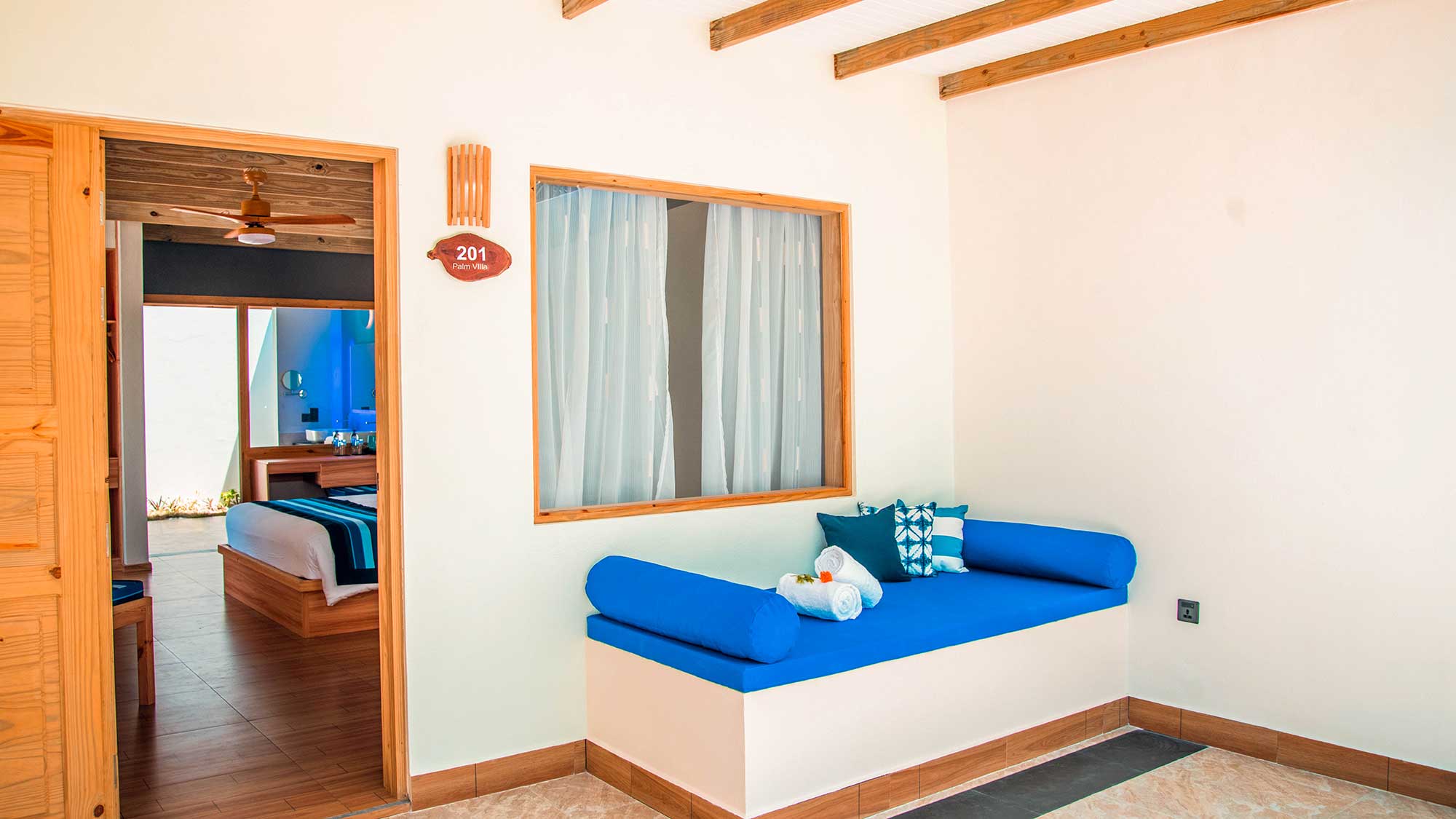 四周环绕着白色的沙滩和清澈的泻湖,享有阿杜环礁宁静的蓝色海景。