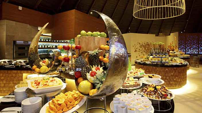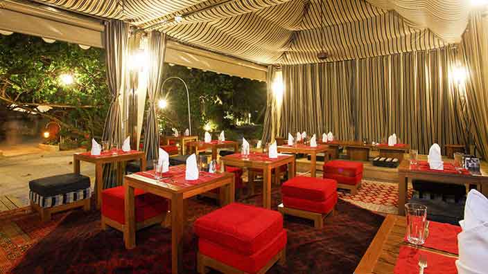 阿拉伯特色风味餐厅在度假村的花园中,舒适的座椅,手工编织的地毯,空气中散发着特别的香味,让您在轻松悠闲的空间享用美食。餐厅除了提供特色烤肉,还有精美沙拉和前菜,以及各种特色面包